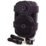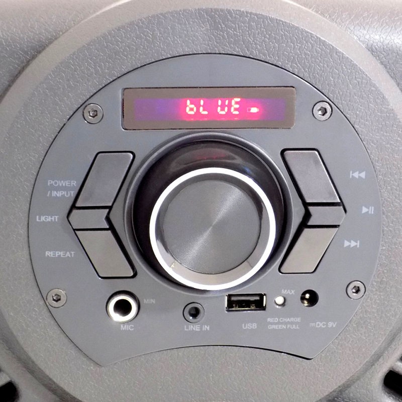 Prijenosni Bluetooth zvučnik 10W, LED svjetla i žičani mikrofon. Uz FM tuner, ulaz za mikrofon za karaoke i linijski priključak za povezivanje tableta, računala s pametnim telefonima i bilo kojeg drugog izvora glazbe. Tehnički podaci: Izlazna snaga: 10W Višenamjenski odgovara unutarnjem ili vanjskom prostoru Podržavaju glazbene formate: MP3, WMA i WAV s izvanrednom kvalitetom FM tuner LED zaslon USB uređaj Bluetooth uređaj Priključak za linijski ulaz Ulaz za mikrofon Žični mikrofon Digitalne karaoke LED rasvjeta Uključen AC adapter Ugrađena punjiva baterija Frekvencijski odziv: 50Hz-20KHz Napajanje: DC 9V Težina: 2,8 kg Dimenzije: 24,4 x 29 x 40,5 cm