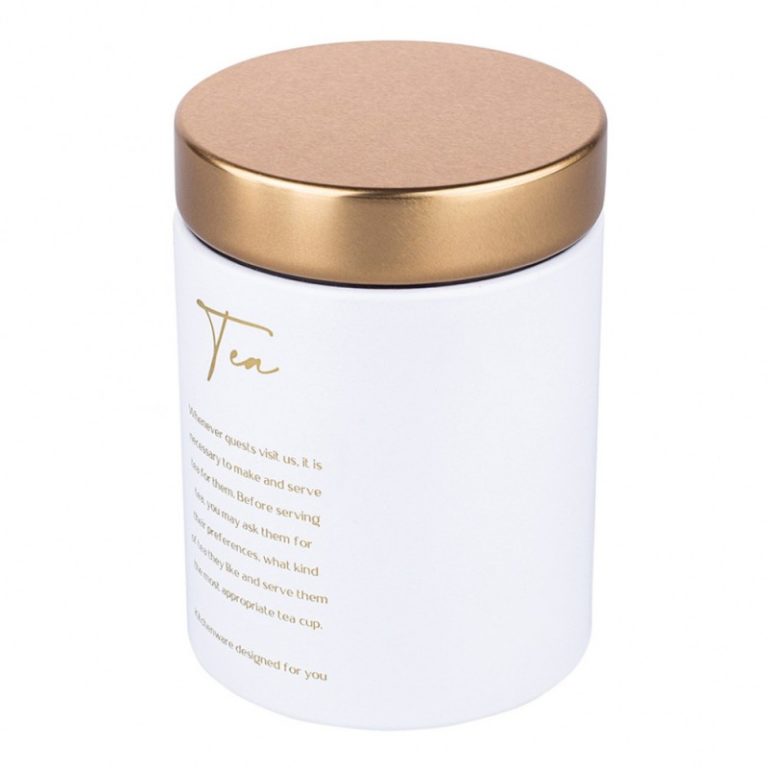 Altom Design okrugla bijela mat limenka sa zlatnim poklopcem 11x11x15 cm dekor Tea – 0204018431