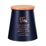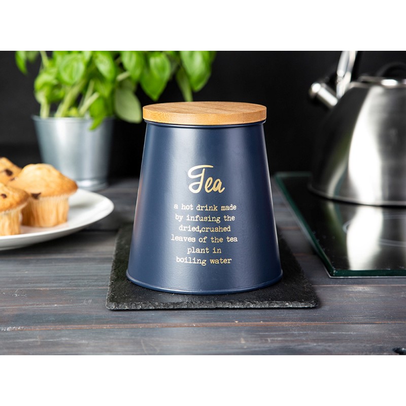 Limenka / posuda za čaj s stožastim bambusovim poklopcem Altom Design tamnoplava, decor TEA Konusne metalne limenke s poklopcima od bambusa praktičan su i dizajnerski način za pohranu kave, čaja, šećera i ostalih sirovina. Dimenzije limenke : promjer poklopca – 10,5 cmpromjer baze – 14 cmvisina – 14,5 cm