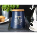 Limenka / posuda za šećer s stožastim bambusovim poklopcem Altom Design tamnoplava, decor SUGAR Konusne metalne limenke s poklopcima od bambusa praktičan su i dizajnerski način za pohranu kave, čaja, šećera i ostalih sirovina. Dimenzije limenke : promjer poklopca – 10,5 cmpromjer baze – 14 cmvisina – 14,5 cm