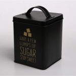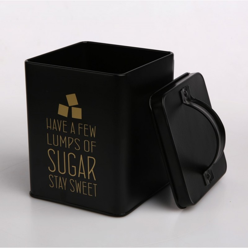 ČETVRTASTA KUTIJA CRNA MAT SA ZLATNIM NATPISOM ŠEĆER 11X11X14 CM Limenka nije samo praktična, već i estetski ukras kuhinje Posebna metoda bojanja limenke čini je otpornijom na koroziju Metalna limenka izrađena je od sigurnih materijala, ne mijenja okus i miris hrane