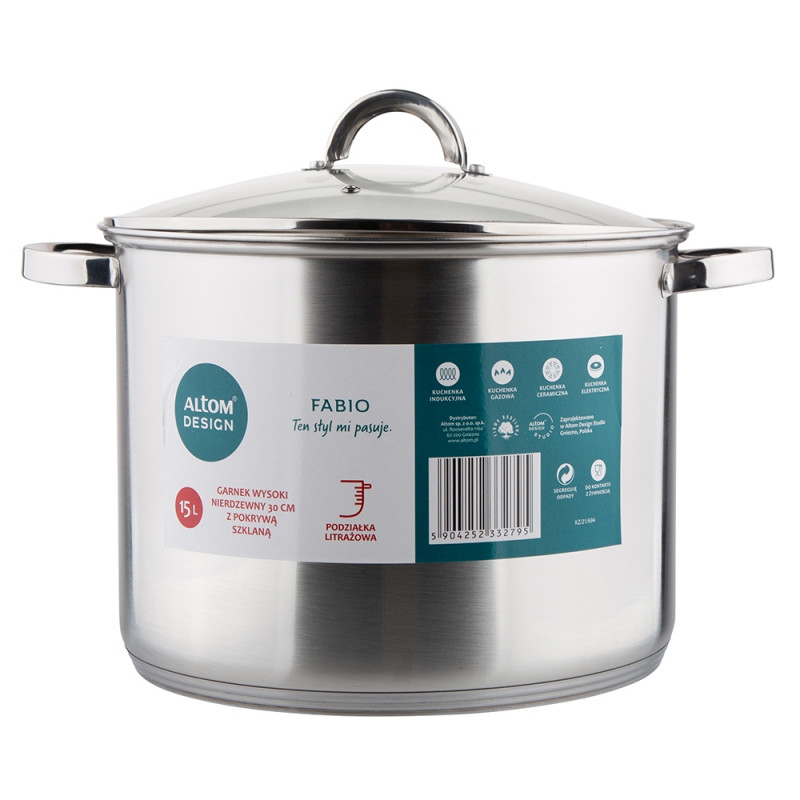 U svakoj kuhinji ključnu ulogu igraju razna jela. Iz tog razloga, marka Altom Design stvorila je lonac iz serije Fabio, koji će postati nezamjenjiv pomagač u kućanstvu. Izrađen od nehrđajućeg čelika, stakleni poklopac štiti sadržaj. Dimenzije lonca: kapacitet 15,0 l promjera 30 cm visina 22 cm Ključni element u svakom kućanstvu su razna jela. Ne razlikuje se od lonca iz Fabio kolekcije Altom Design. Izrađen od nehrđajućeg čelika, proizvod će biti nezamjenjiv pomagač pri pripremi jela. Osim toga, stakleni poklopac s rupom zaštitit će hranu. Lonac je nezamjenjiv element u svakoj kuhinji. Lonac će pomoći u pripremi raznih juha, kao i mnogih drugih jela. Izrađen od nehrđajućeg čelika, proizvod je izuzetno izdržljiv. Dobro oblikovane ručke jamče udobno nošenje. Unutar lonca možete pronaći mjernu skalu. Posuđe se može koristiti na svim vrstama štednjaka. Stakleni poklopac s rupom za paru štiti sadržaj lonca od onečišćenja. U Fabio kolekciji by Altom Design možete pronaći lonce različitih kapaciteta.