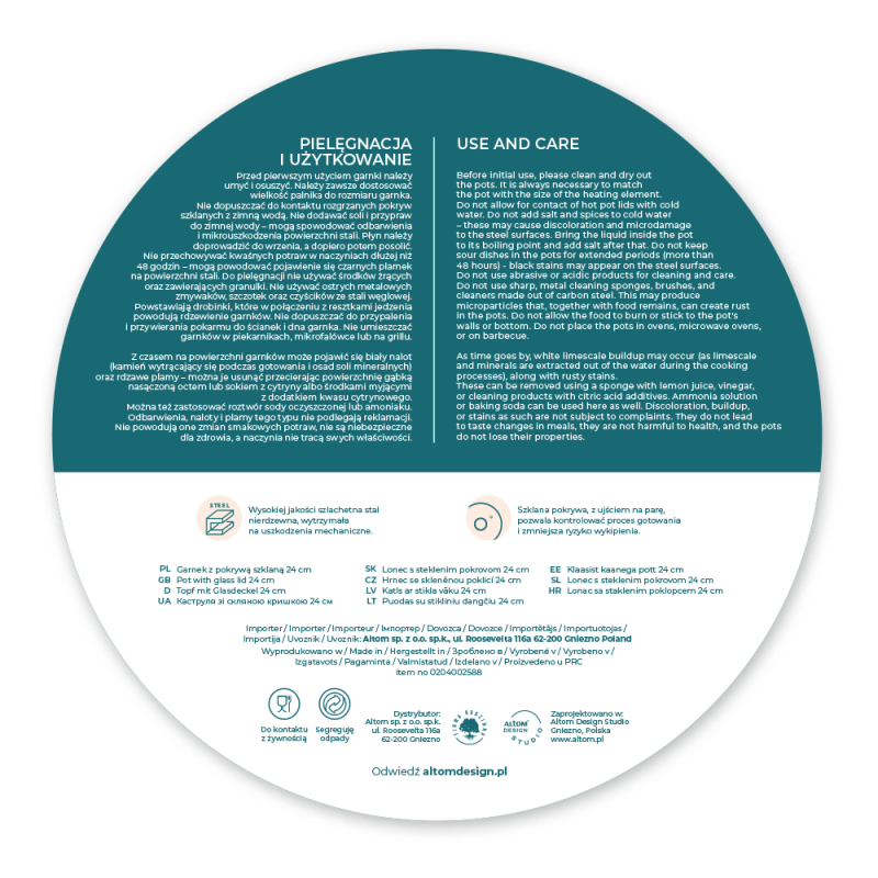 Emilio lonci od nehrđajućeg čelika – elegancija i trajnost na vašem kuhinjskom putu. Emilio lonci od nehrđajućeg čelika kombinacija su trajnosti, funkcionalnosti i elegancije u jednom. Izrađene od visokokvalitetnog nehrđajućeg čelika, izrađene su kako bi se suočile i s najzahtjevnijim kulinarskim izazovima. Bez obzira jeste li iskusni kuhar ili tek započinjete svoju avanturu kuhanjem – naši lonci bit će vaš nezamjenjiv partner u kuhinji i pomoći će vam da postignete izvrsne rezultate. · Napravljene posude izrađena od najkvalitetnijeg nehrđajućeg čelika, koji predviđa Čak i raspodjela topline za savršene kulinarske rezultate. · Nehrđajući čelik je Otporan na koroziju, mrlje i mehanička oštećenja, što znači da će lonci zadržati svoj izgled i funkcionalnost dugi niz godina. · Debljina stijenke lonca je 0,4 mm, tako da Posuđe duže čuva toplinu. · Hvala prozirni stakleni poklopci, možete slijediti svaki korak kuhanja bez potrebe za skidanjem, štedeći vam vrijeme i energiju. · Odušak za paru U poklopcu vam omogućuje kontrolu količine pare koja se oslobađa tijekom kuhanja. · Nehrđajući čelik je prehrambeno neutralan materijal, što znači da ne ispušta tvari u posuđe i ne mijenja njihov okus. · Minimalistički i moderan dizajn lonaca iz kolekcije Emilio čini uklopiti se u svaki interijer. · Bakelitne ručke otporni su na temperature do 180 °C. · Nehrđajući čelik lako se održava čistim. Emilio Lonci mMožete ga oprati u perilici posuđa. · Lonac od nehrđajućeg čelika možete koristiti na svim vrstama štednjaka, uključujući indukciju. Kapacitet proizvoda : 4,2 l Promjer: 24 cm Visina: 11,5 cm