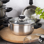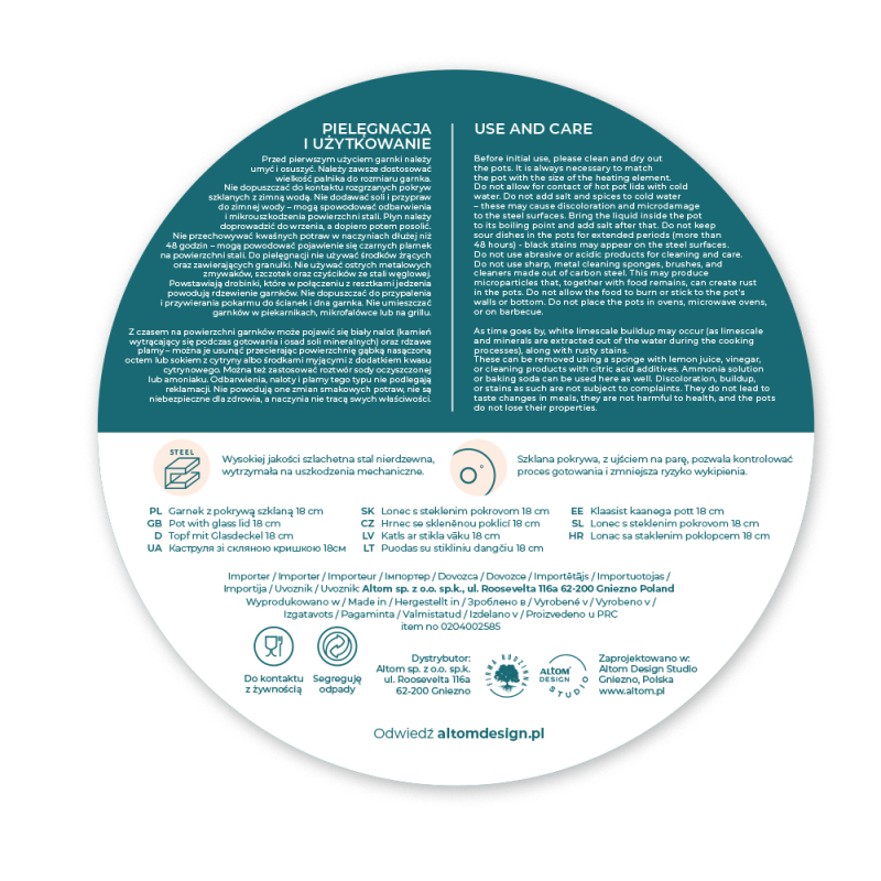 Emilio lonci od nehrđajućeg čelika – elegancija i trajnost na vašem kuhinjskom putu. Emilio lonci od nehrđajućeg čelika kombinacija su trajnosti, funkcionalnosti i elegancije u jednom. Izrađene od visokokvalitetnog nehrđajućeg čelika, izrađene su kako bi se suočile i s najzahtjevnijim kulinarskim izazovima. Bez obzira jeste li iskusni kuhar ili tek započinjete svoju avanturu kuhanjem – naši lonci bit će vaš nezamjenjiv partner u kuhinji i pomoći će vam da postignete izvrsne rezultate. · Napravljene posude izrađena od najkvalitetnijeg nehrđajućeg čelika, koji predviđa Čak i raspodjela topline za savršene kulinarske rezultate. · Nehrđajući čelik je Otporan na koroziju, mrlje i mehanička oštećenja, što znači da će lonci zadržati svoj izgled i funkcionalnost dugi niz godina. · Debljina stijenke lonca je 0,4 mm, tako da Posuđe duže čuva toplinu. · Hvala prozirni stakleni poklopci, možete slijediti svaki korak kuhanja bez potrebe za skidanjem, štedeći vam vrijeme i energiju. · Odušak za paru U poklopcu vam omogućuje kontrolu količine pare koja se oslobađa tijekom kuhanja. · Nehrđajući čelik je prehrambeno neutralan materijal, što znači da ne ispušta tvari u posuđe i ne mijenja njihov okus. · Minimalistički i moderan dizajn lonaca iz kolekcije Emilio čini uklopiti se u svaki interijer. · Bakelitne ručke otporni su na temperature do 180 °C. · Nehrđajući čelik lako se održava čistim. Emilio Lonci mMožete ga oprati u perilici posuđa. · Lonac od nehrđajućeg čelika možete koristiti na svim vrstama štednjaka, uključujući indukciju. Kapacitet proizvoda : 1,9 l Promjer: 18 cm Visina: 8,5 cm