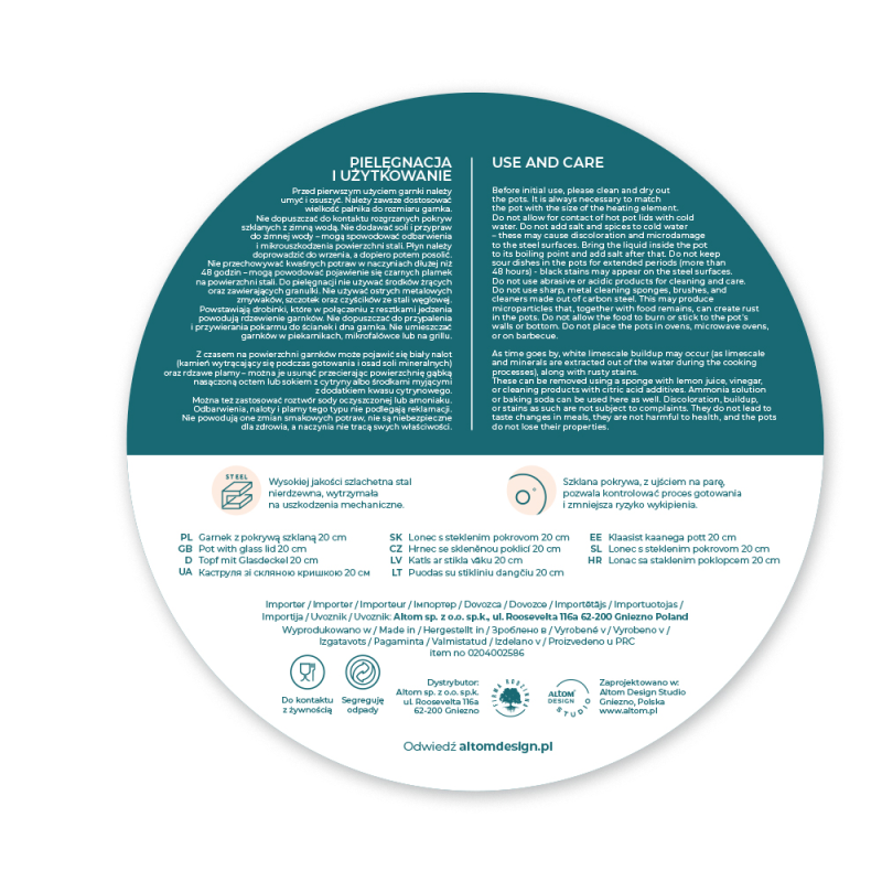 Emilio lonci od nehrđajućeg čelika – elegancija i trajnost na vašem kuhinjskom putu. Emilio lonci od nehrđajućeg čelika kombinacija su trajnosti, funkcionalnosti i elegancije u jednom. Izrađene od visokokvalitetnog nehrđajućeg čelika, izrađene su kako bi se suočile i s najzahtjevnijim kulinarskim izazovima. Bez obzira jeste li iskusni kuhar ili tek započinjete svoju avanturu kuhanjem – naši lonci bit će vaš nezamjenjiv partner u kuhinji i pomoći će vam da postignete izvrsne rezultate. · Napravljene posude izrađena od najkvalitetnijeg nehrđajućeg čelika, koji predviđa Čak i raspodjela topline za savršene kulinarske rezultate. · Nehrđajući čelik je Otporan na koroziju, mrlje i mehanička oštećenja, što znači da će lonci zadržati svoj izgled i funkcionalnost dugi niz godina. · Debljina stijenke lonca je 0,4 mm, tako da Posuđe duže čuva toplinu. · Hvala prozirni stakleni poklopci, možete slijediti svaki korak kuhanja bez potrebe za skidanjem, štedeći vam vrijeme i energiju. · Odušak za paru U poklopcu vam omogućuje kontrolu količine pare koja se oslobađa tijekom kuhanja. · Nehrđajući čelik je prehrambeno neutralan materijal, što znači da ne ispušta tvari u posuđe i ne mijenja njihov okus. · Minimalistički i moderan dizajn lonaca iz kolekcije Emilio čini uklopiti se u svaki interijer. · Bakelitne ručke otporni su na temperature do 180 °C. · Nehrđajući čelik lako se održava čistim. Emilio Lonci mMožete ga oprati u perilici posuđa. · Lonac od nehrđajućeg čelika možete koristiti na svim vrstama štednjaka, uključujući indukciju. Kapacitet proizvoda : 2,5 l Promjer: 20 cm Visina: 9,5 cm