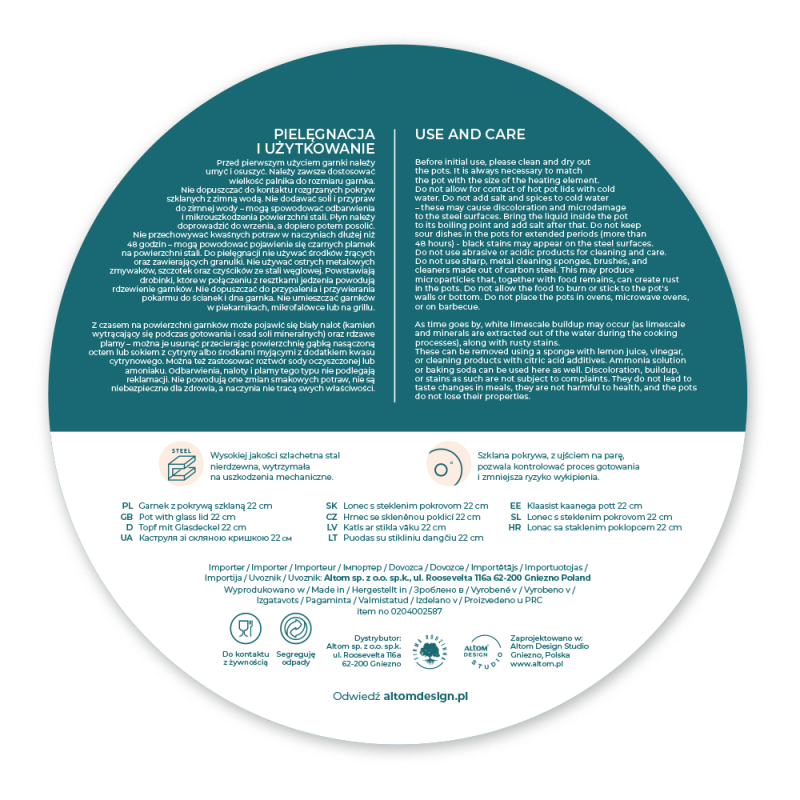 Emilio lonci od nehrđajućeg čelika – elegancija i trajnost na vašem kuhinjskom putu. Emilio lonci od nehrđajućeg čelika kombinacija su trajnosti, funkcionalnosti i elegancije u jednom. Izrađene od visokokvalitetnog nehrđajućeg čelika, izrađene su kako bi se suočile i s najzahtjevnijim kulinarskim izazovima. Bez obzira jeste li iskusni kuhar ili tek započinjete svoju avanturu kuhanjem – naši lonci bit će vaš nezamjenjiv partner u kuhinji i pomoći će vam da postignete izvrsne rezultate. · Napravljene posude izrađena od najkvalitetnijeg nehrđajućeg čelika, koji predviđa Čak i raspodjela topline za savršene kulinarske rezultate. · Nehrđajući čelik je Otporan na koroziju, mrlje i mehanička oštećenja, što znači da će lonci zadržati svoj izgled i funkcionalnost dugi niz godina. · Debljina stijenke lonca je 0,4 mm, tako da Posuđe duže čuva toplinu. · Hvala prozirni stakleni poklopci, možete slijediti svaki korak kuhanja bez potrebe za skidanjem, štedeći vam vrijeme i energiju. · Odušak za paru U poklopcu vam omogućuje kontrolu količine pare koja se oslobađa tijekom kuhanja. · Nehrđajući čelik je prehrambeno neutralan materijal, što znači da ne ispušta tvari u posuđe i ne mijenja njihov okus. · Minimalistički i moderan dizajn lonaca iz kolekcije Emilio čini uklopiti se u svaki interijer. · Bakelitne ručke otporni su na temperature do 180 °C. · Nehrđajući čelik lako se održava čistim. Emilio Lonci mMožete ga oprati u perilici posuđa. · Lonac od nehrđajućeg čelika možete koristiti na svim vrstama štednjaka, uključujući indukciju. Kapacitet proizvoda : 3,2 l Promjer: 22 cm Visina: 10,5 cm
