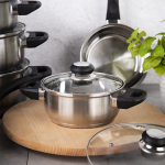 Emilio lonci od nehrđajućeg čelika – elegancija i trajnost na vašem kuhinjskom putu. Emilio lonci od nehrđajućeg čelika kombinacija su trajnosti, funkcionalnosti i elegancije u jednom. Izrađene od visokokvalitetnog nehrđajućeg čelika, izrađene su kako bi se suočile i s najzahtjevnijim kulinarskim izazovima. Bez obzira jeste li iskusni kuhar ili tek započinjete svoju avanturu kuhanjem – naši lonci bit će vaš nezamjenjiv partner u kuhinji i pomoći će vam da postignete izvrsne rezultate. · Napravljene posude izrađena od najkvalitetnijeg nehrđajućeg čelika, koji predviđa Čak i raspodjela topline za savršene kulinarske rezultate. · Nehrđajući čelik je Otporan na koroziju, mrlje i mehanička oštećenja, što znači da će lonci zadržati svoj izgled i funkcionalnost dugi niz godina. · Debljina stijenke lonca je 0,4 mm, tako da Posuđe duže čuva toplinu. · Hvala prozirni stakleni poklopci, možete slijediti svaki korak kuhanja bez potrebe za skidanjem, štedeći vam vrijeme i energiju. · Odušak za paru U poklopcu vam omogućuje kontrolu količine pare koja se oslobađa tijekom kuhanja. · Nehrđajući čelik je prehrambeno neutralan materijal, što znači da ne ispušta tvari u posuđe i ne mijenja njihov okus. · Minimalistički i moderan dizajn lonaca iz kolekcije Emilio čini uklopiti se u svaki interijer. · Bakelitne ručke otporni su na temperature do 180 °C. · Nehrđajući čelik lako se održava čistim. Emilio Lonci mMožete ga oprati u perilici posuđa. · Lonac od nehrđajućeg čelika možete koristiti na svim vrstama štednjaka, uključujući indukciju. Kapacitet proizvoda : 1,2 l Promjer: 16 cm Visina: 7,5 cm