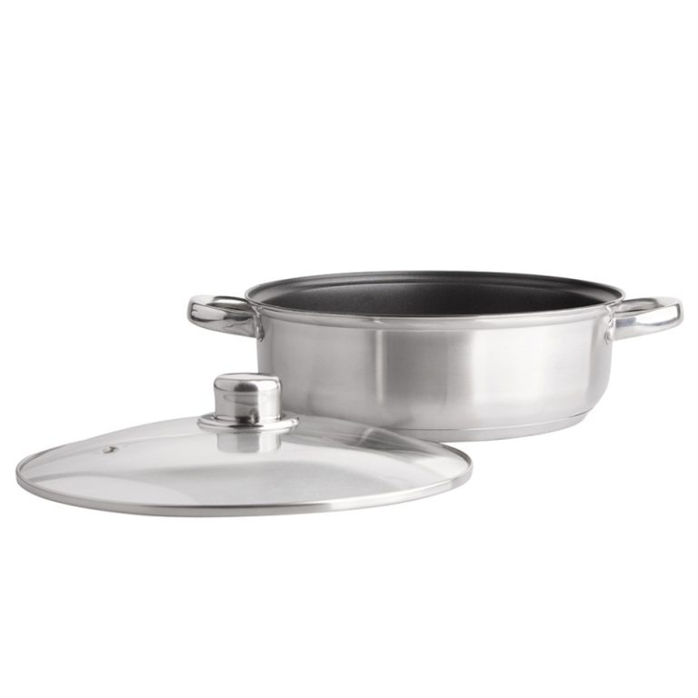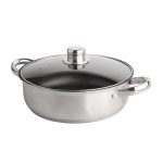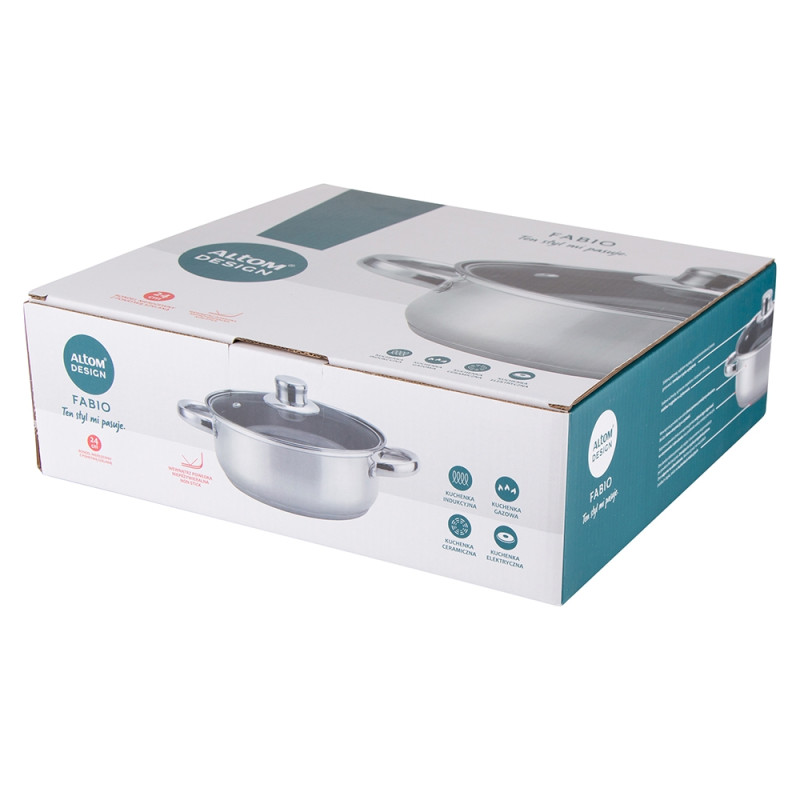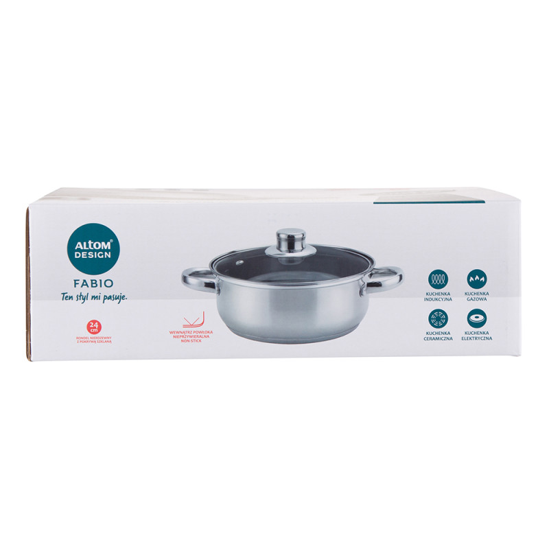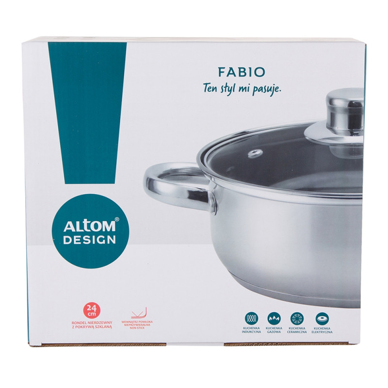 FABIO LONAC OD NEHRĐAJUĆEG ČELIKA 2,6L. 24CM SA STAKLENIM POKLOPCEM Lonac je izrađen od izdržljivog i sigurnog nehrđajućeg čelika Lonac od nehrđajućeg čelika lako se čisti. Sigurno za perilicu posuđa Lonac od nehrđajućeg čelika može se koristiti na svim vrstama štednjaka, uključujući indukcijske štednjake Unutar lonca nalazi se mjerna traka koja će olakšati mjerenje Stakleni poklopac savršeno se uklapa u lonac. Ima rupu za izlaz pare kapacitet 2,6 l promjer 24 cm visina 8,5 cm