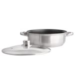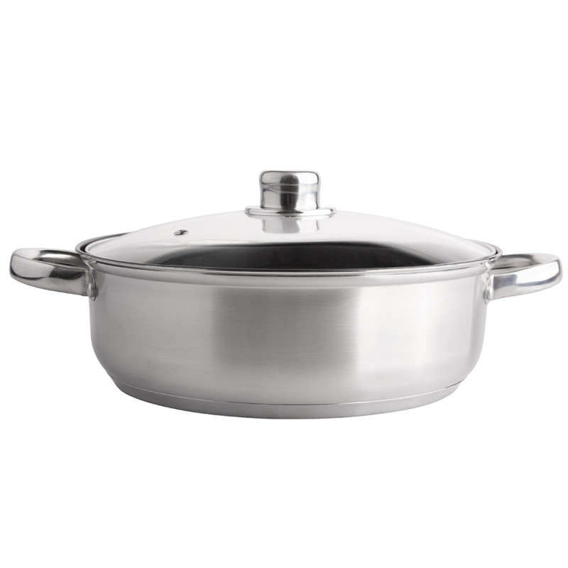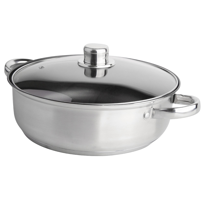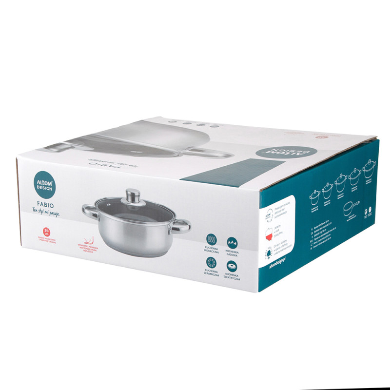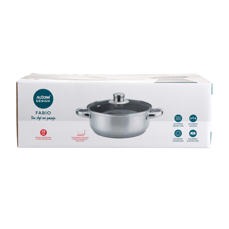 FABIO LONAC OD NEHRĐAJUĆEG ČELIKA 3,5 L. 26CM SA STAKLENIM POKLOPCEM Lonac je izrađen od izdržljivog i sigurnog nehrđajućeg čelika Lonac od nehrđajućeg čelika lako se čisti. Sigurno za perilicu posuđa Lonac od nehrđajućeg čelika može se koristiti na svim vrstama štednjaka, uključujući indukcijske štednjake Unutar lonca nalazi se mjerna traka koja će olakšati mjerenje Stakleni poklopac savršeno se uklapa u lonac. Ima rupu za izlaz pare kapacitet 3,5 l promjer 26 cm visina 9 cm