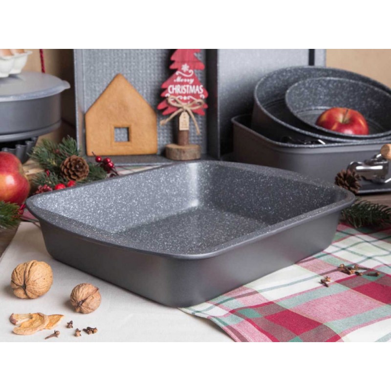 Kalup za pečenje Altom Design izrađen je od čvrstog ugljičnog čelika, što ga čini izdržljivim i ne deformira se tijekom uporabe Neljepljivi premaz atraktivnog izgleda poput kamena, ima izvrsna svojstva koja se ne lijepe zahvaljujući čemu sprječava izgaranje hrane i olakšava uklanjanje gotovih jela Svoju jedinstvenost ponajprije duguje nepropusnosti zahvaljujući kojoj se pečeni proizvodi ne isušuju i zadržavaju punu aromu. Pravilno održavan kalup, služit će vam dugi niz godina (nemojte koristiti oštre predmete koji mogu ogrebati premaz) Zbog materijala od kojih se izrađuje kalup (čelik), nemojte ga stavljati u mikrovalnu pećnicu (metal odražava valove, možete oštetiti posudu i mikrovalnu pećnicu) Da biste dugo uživali u svojstvima posude za pečenje, nemojte je izlagati brzim promjenama temperature (npr. ne stavljajte je u vruću pećnicu odmah nakon što je izvadite iz hladnjaka Posuda za pečenje prikladna je za rad na temperaturama do 230 ° C
