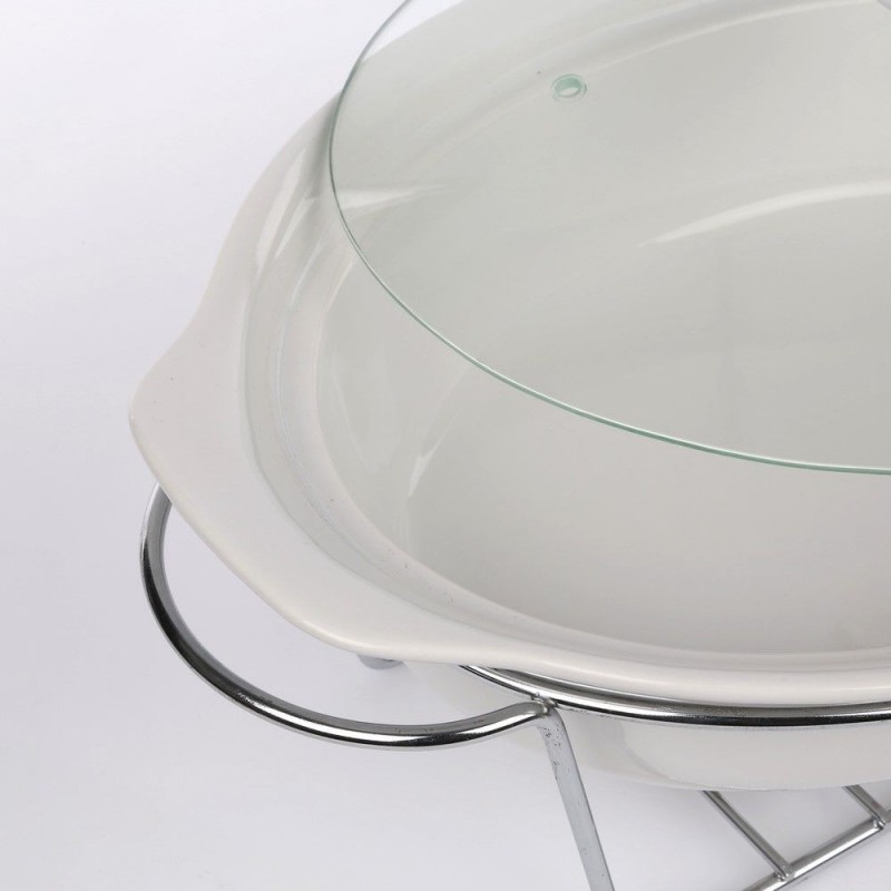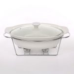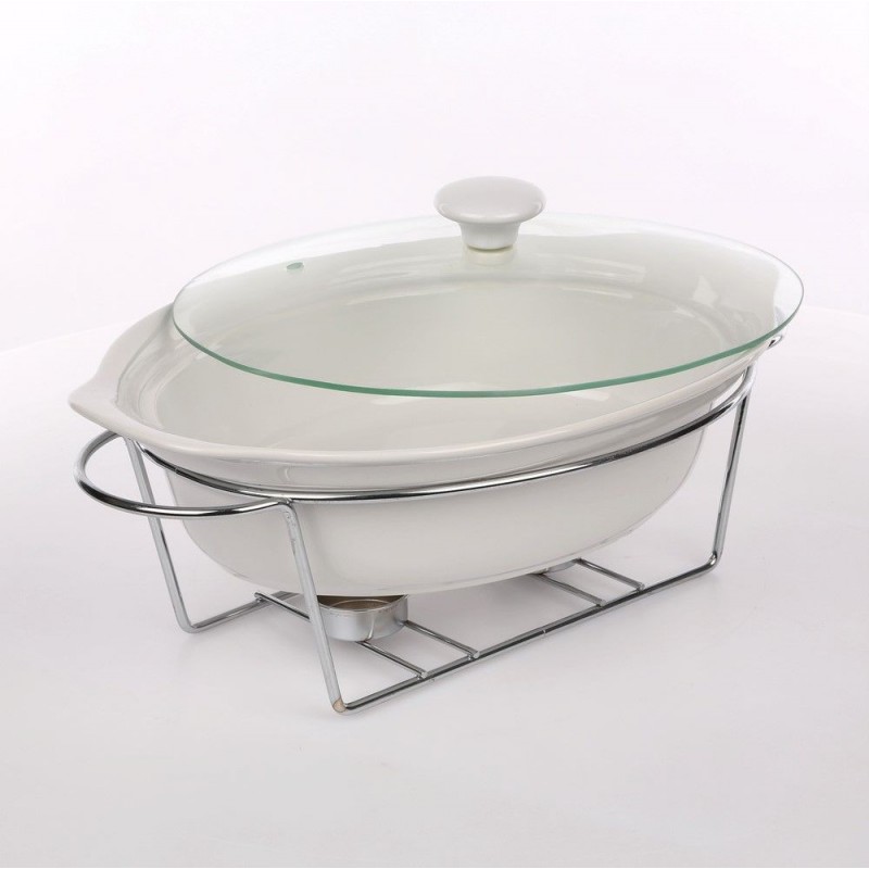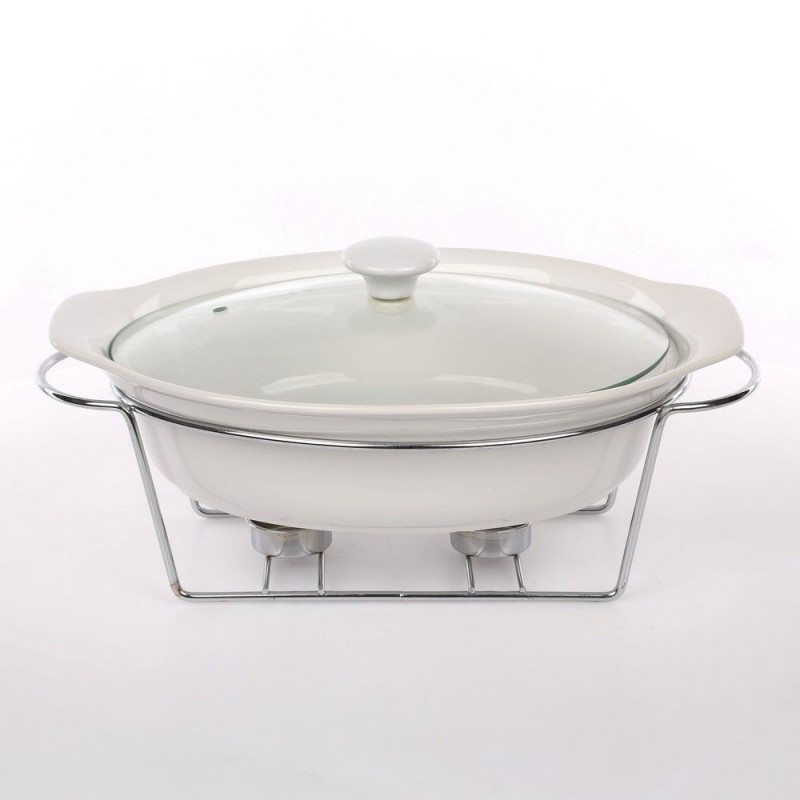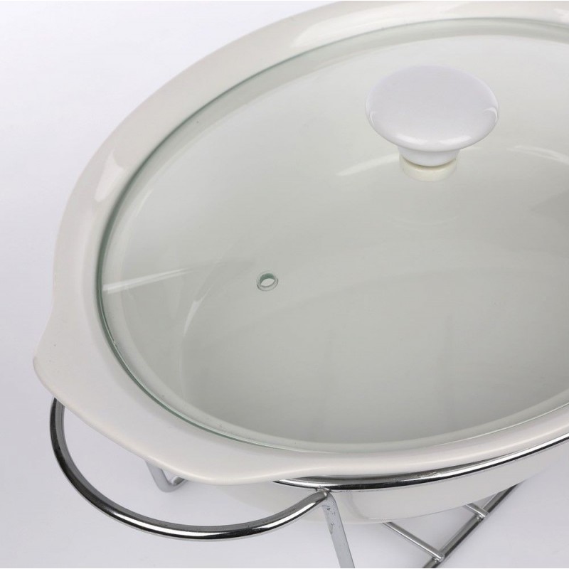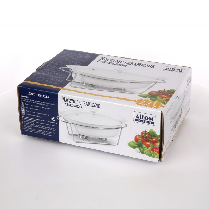 Jela poslužena na stolu koja se ne hlade? Da, to je sada moguće s linijom porculanske posude na grijaču. Posuđe Altom Design je izvrstan način učinkovitog posluživanja jela. Zahvaljujući pečenju jela s grijačima, možemo duže održavati pravu temperaturu, ukus i aromu pripremljenih jela, a istovremeno očarati goste učinkovitim posluživanjem. Linija porculanskog posuđa na grijaču kombinacija je elegancije i upotrebljivosti Oni će savršeno poslužiti ne samo za pripremu obiteljskih obroka , već i pomoći u učinkovitom posluživanju jela tijekom raskošnih zabava Omogućuje vam pečenje jela na visokoj temperaturi u pećnici i mikrovalnoj pećnici Univerzalna, bijela boja posuđa čini da se savršeno kombiniraju s bilo kojim posuđem Stabilni stalak izrađen od kromiranog čelika omogućuje vam posluživanje vruće hrane ravno iz pećnice do stola Otvor za paru smanjuje tlak u posudi. Glatku površinu od keramike lako održavamo čistom, posuđe se može prati u perilicama posuđa Dimenzije posude:širina: 24 cm, dužina: 33 cm,visina: 12 cm,kapacitet: 2,2 l