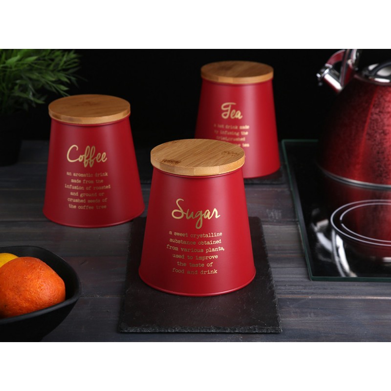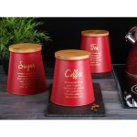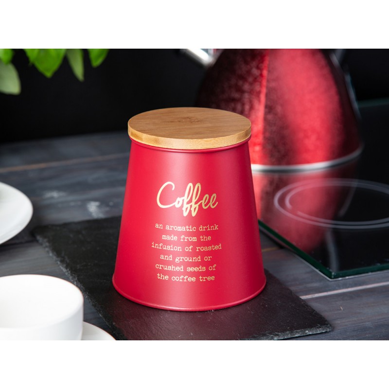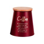 Posuda za kavu s stožastim bambusovim poklopcem Altom Design crvena, ukrasna COFFEE Konusne metalne limenke s poklopcima od bambusa praktičan su i dizajnerski način za pohranu kave, čaja, šećera i ostalih sirovina. Dimenzije limenke : promjer poklopca – 10,5 cmpromjer baze – 14 cmvisina – 14,5 cm