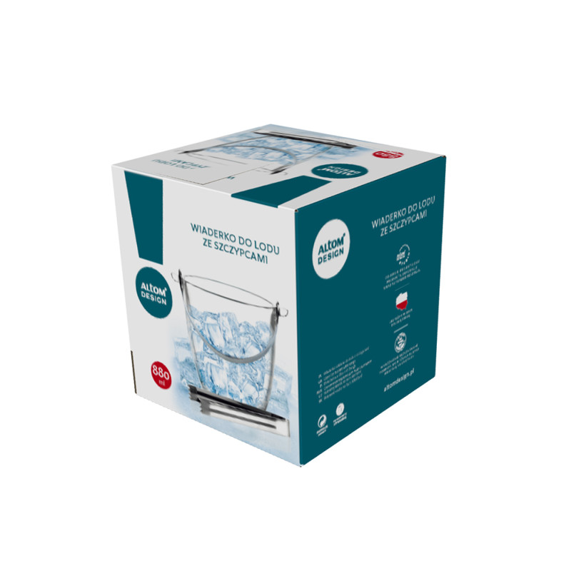 volumen: 880 ml visina 13,8 cm promjer 12,5 cm Posuda za led je izvrstan način posluživanja rashlađenih pića ili kockica leda. Staklena posuda s ručkom uklopit će se u bilo koji raspored stola, kao i u unutrašnjost. Kliješta vam omogućuju nanošenje kockica leda.