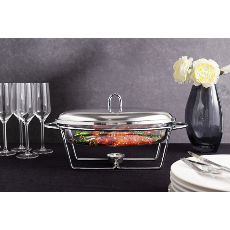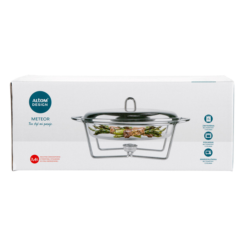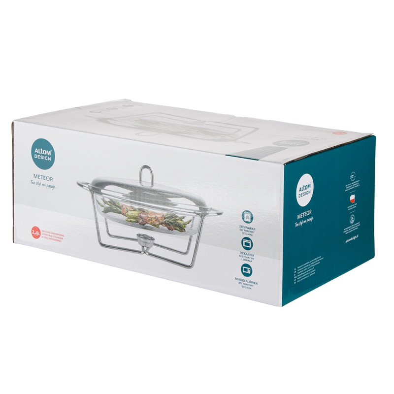 Jela poslužena na stolu koja se ne hlade? Da, sada je to moguće s linijom posuđa otpornih na toplinu na grijaču. Zahvaljujući posudama otpornim na toplinu na grijaču, možemo duže održavati pravu temperaturu, okus i aromu pripremljenih jela, a istovremeno očarati goste učinkovitim posluživanjem. kapacitet – 2,4 ldužine – 40,5 cm širine – 21 cm visine – 16,5 cm Linija posuđa otpornih na toplinu na grijaču kombinacija je elegancije i upotrebljivosti Posuđe na grijaču savršeno je za posluživanje jela tijekom raskošnih zabava Praktična, staklena jela savršeno se stapaju s bilo kojim posuđem Stabilan stalak od kromiranog čelika ima prostora za postavljanje svijeća Zahvaljujući grijačima, poslužena jela dugo će ostati topla Glatka staklena površina može se lako održavati čistom, posuda se može oprati u perilicama posuđa (osim postolja)