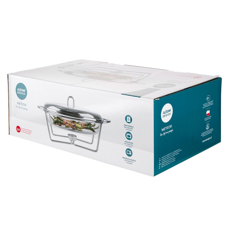 Jela poslužena na stolu koja se ne hlade? Da, sada je to moguće s linijom posuđa otpornih na toplinu na grijaču. Zahvaljujući posudama otpornim na toplinu na grijaču, možemo duže održavati pravu temperaturu, okus i aromu pripremljenih jela, a istovremeno očarati goste učinkovitim posluživanjem. kapacitet – 3,3 Ldužine – 44 cm širine – 25,5 cm visine – 16 cm Linija posuđa otpornih na toplinu na grijaču kombinacija je elegancije i upotrebljivosti Posuđe na grijaču savršeno je za posluživanje jela tijekom raskošnih zabava Praktična, staklena jela savršeno se stapaju s bilo kojim posuđem Stabilan stalak od kromiranog čelika ima prostora za postavljanje svijeća Zahvaljujući grijačima, poslužena jela dugo će ostati topla Glatka staklena površina može se lako održavati čistom, posuda se može oprati u perilicama posuđa (osim postolja)