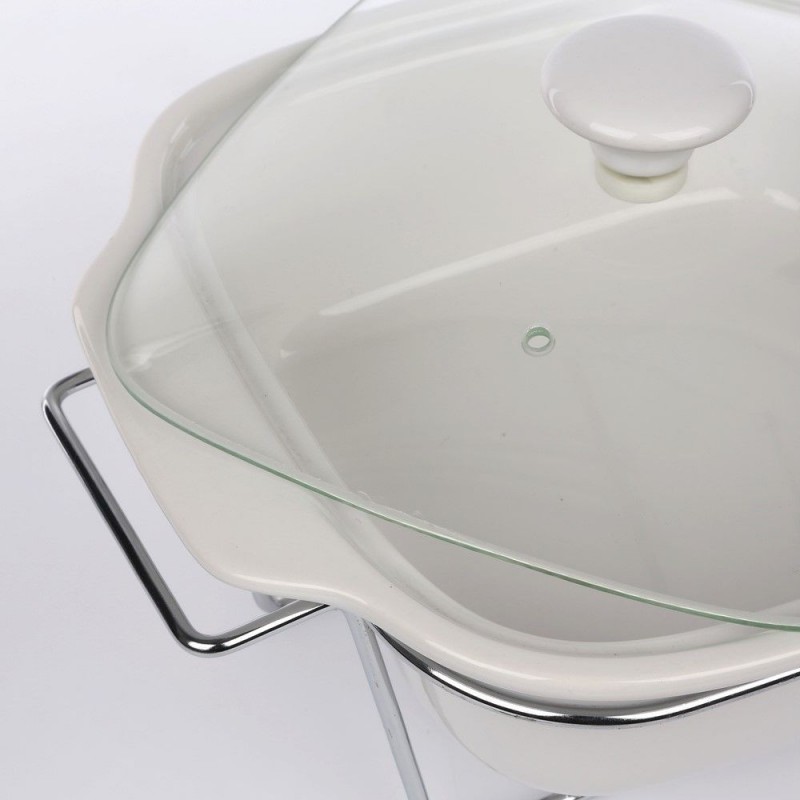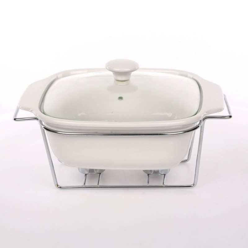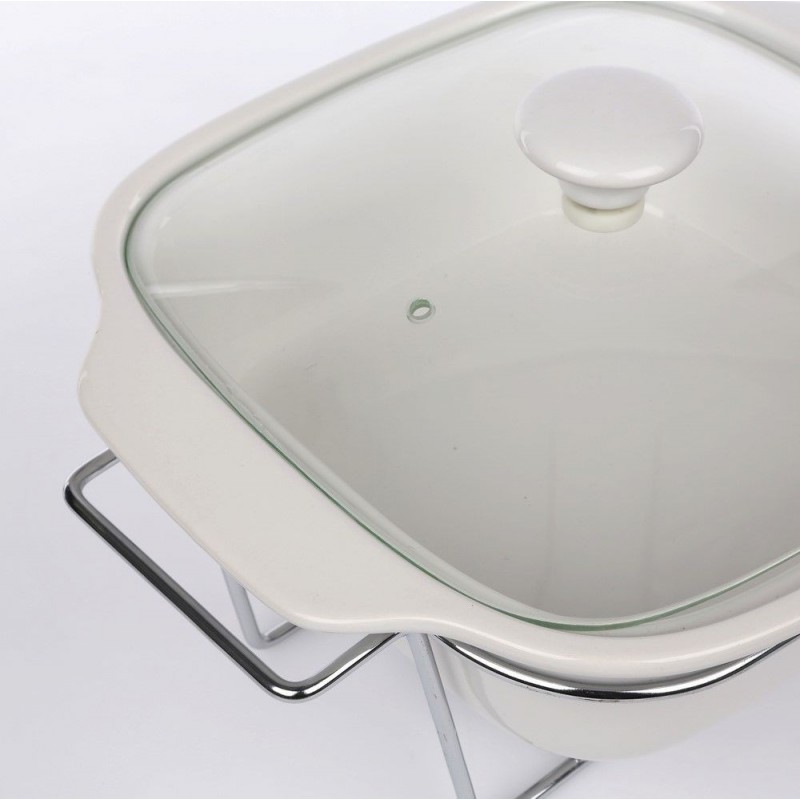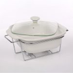 Jela poslužena na stolu koja se ne hlade? Da, to je sada moguće s linijom porculanske posude na grijaču. Posuđe Altom Design je izvrstan način učinkovitog posluživanja jela. Zahvaljujući pečenju jela s grijačima, možemo duže održavati pravu temperaturu, ukus i aromu pripremljenih jela, a istovremeno očarati goste učinkovitim posluživanjem. Linija porculanskog posuđa na grijaču kombinacija je elegancije i upotrebljivosti Oni će savršeno poslužiti ne samo za pripremu obiteljskih obroka , već i pomoći u učinkovitom posluživanju jela tijekom raskošnih zabava Omogućuje vam pečenje jela na visokoj temperaturi u pećnici i mikrovalnoj pećnici Univerzalna, bijela boja posuđa čini da se savršeno kombiniraju s bilo kojim posuđem Stabilni stalak izrađen od kromiranog čelika omogućuje vam posluživanje vruće hrane ravno iz pećnice do stola Otvor za paru smanjuje tlak u posudi. Glatku površinu od keramike lako održavamo čistom, posuđe se može prati u perilicama posuđa Dimenzije posude:dužina: 30 cm,širina: 24 cm,visina: 12 cm,kapacitet: 2 l