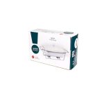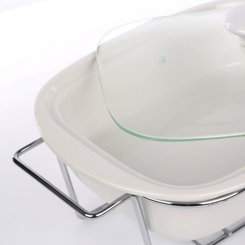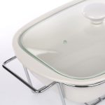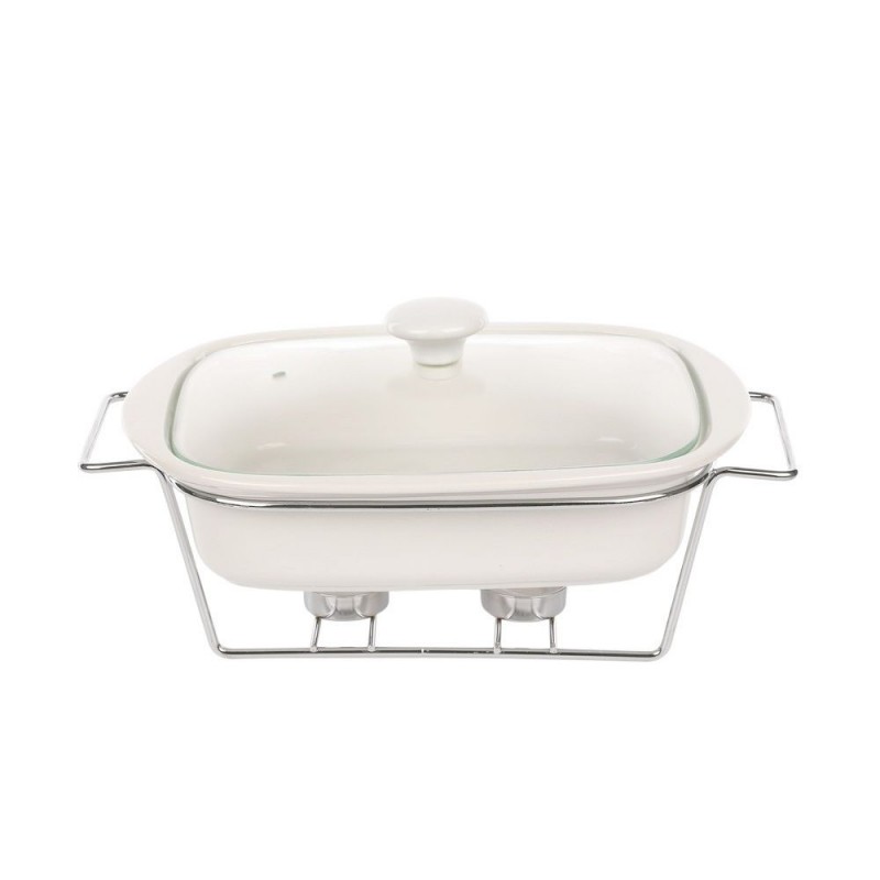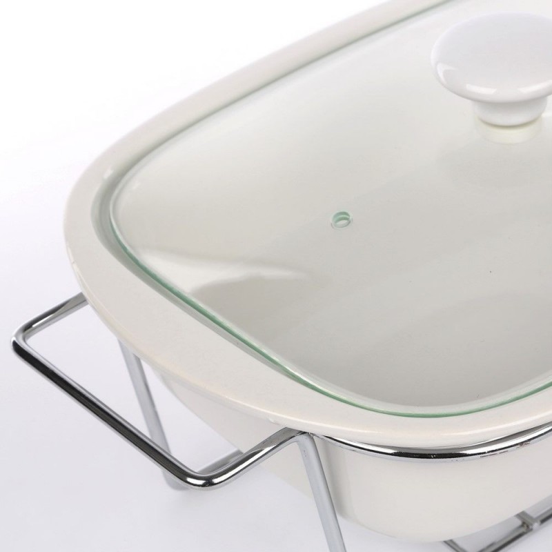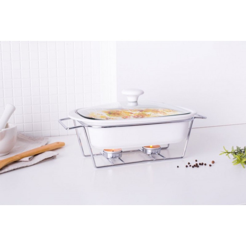 · Linija porculanskog posuđa na grijaču kombinacija je elegancije i korisnih vrijednosti. · Omogućuje vam pečenje jela na visokoj temperaturi u pećnici i mikrovalnoj pećnici. Univerzalna, bijela boja posuđa čini ih savršenima za svaki stol. Stabilno postolje izrađeno od kromiranog čelika omogućuje vam posluživanje tople hrane izravno od pećnice do stola. Zahvaljujući grijačima, servirana jela dugo će ostati topla. Stakleni poklopac završen keramičkom ručkom omogućuje upotrebu u pećnici bez straha od pucanja. Izlaz pare smanjuje pritisak unutar posude, smanjujući mogućnost prekuhavanja hrane. Glatka keramička površina lako se čisti, posuđe se može prati u perilicama posuđa bez ikakvih prepreka. Dimenzije posude:dužina: 33 cm,širina: 21,5 cm,visina: 11 cm,kapacitet: 1,4 l