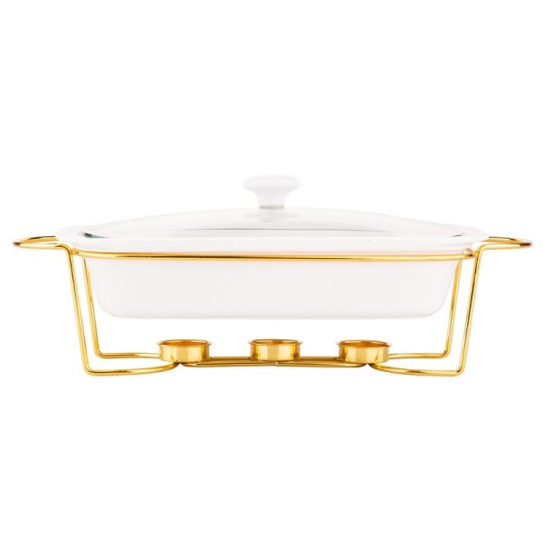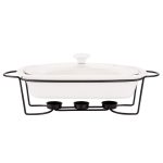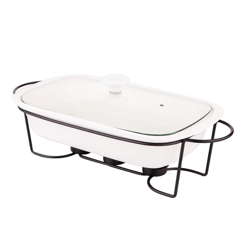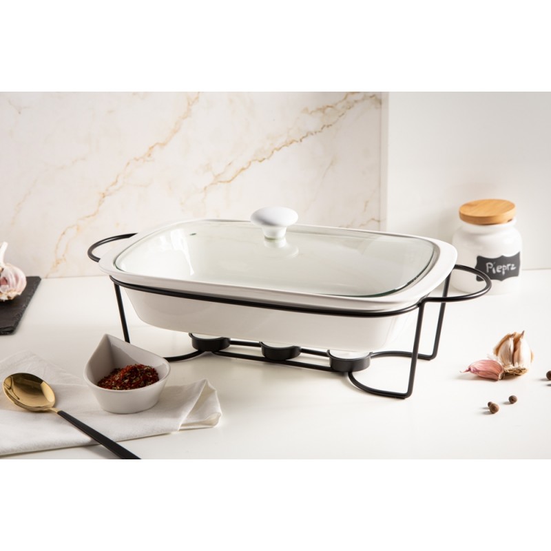 Linija porculanskog posuđa Mesa na grijaču kombinacija je elegancije i korisnih vrijednosti. Omogućuje vam pečenje jela na visokoj temperaturi u pećnici i mikrovalnoj pećnici. Univerzalna, bijela boja posuđa čini ih savršenima za svaki stol. Stabilno postolje izrađeno od kromiranog čelika omogućuje vam posluživanje tople hrane izravno od pećnice do stola. Zahvaljujući grijačima, servirana jela dugo će ostati topla. Stakleni poklopac završen keramičkom ručkom omogućuje upotrebu u pećnici bez straha od pucanja. Izlaz pare smanjuje pritisak unutar posude, smanjujući mogućnost prekuhavanja hrane. Glatka keramička površina lako se čisti, posuđe se može prati u perilicama posuđa bez ikakvih prepreka. duljina – 41,8 cm širina – 12,5 cm visina – 21,6 cm kapaciteta – 1,7 l