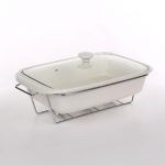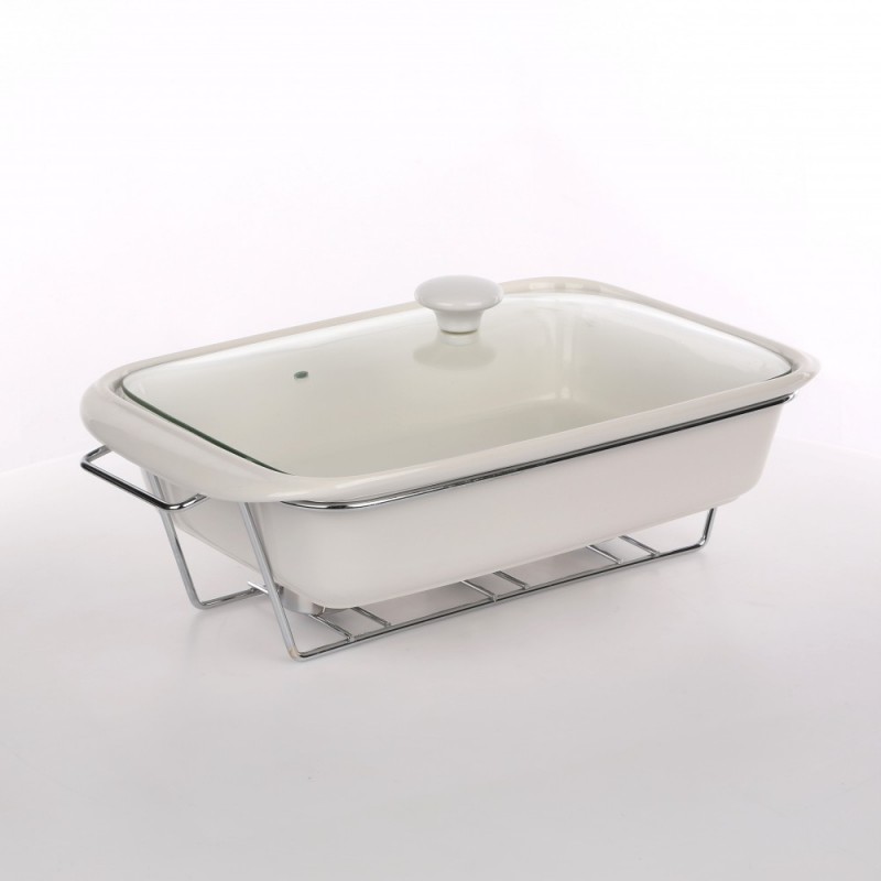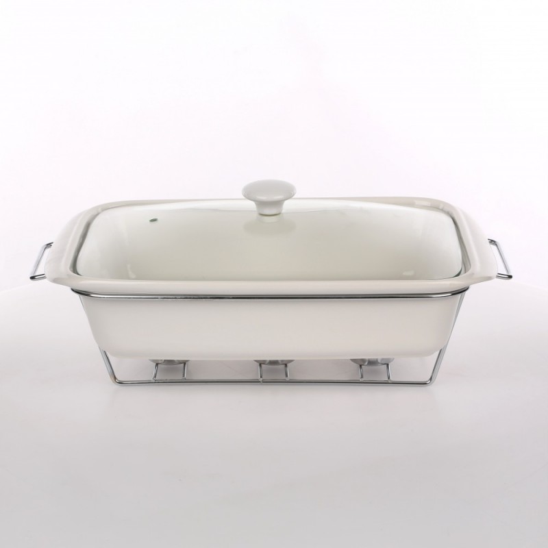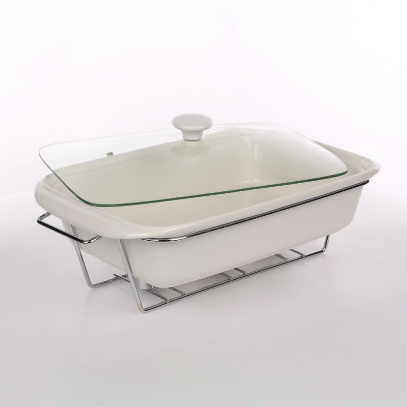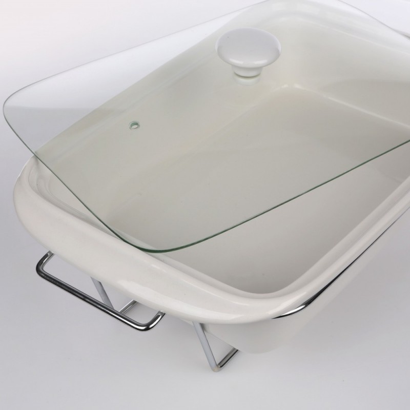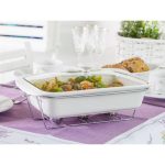 Jela poslužena na stolu koja se ne hlade? Da, to je sada moguće s linijom porculanske posude na grijaču. Posuđe Altom Design je izvrstan način učinkovitog posluživanja jela. Zahvaljujući pečenju jela s grijačima, možemo duže održavati pravu temperaturu, ukus i aromu pripremljenih jela, a istovremeno očarati goste učinkovitim posluživanjem. Linija porculanskog posuđa na grijaču kombinacija je elegancije i upotrebljivosti Oni će savršeno poslužiti ne samo za pripremu obiteljskih obroka , već i pomoći u učinkovitom posluživanju jela tijekom raskošnih zabava Omogućuje vam pečenje jela na visokoj temperaturi u pećnici i mikrovalnoj pećnici Univerzalna, bijela boja posuđa čini da se savršeno kombiniraju s bilo kojim posuđem Stabilni stalak izrađen od kromiranog čelika omogućuje vam posluživanje vruće hrane ravno iz pećnice do stola Otvor za paru smanjuje tlak u posudi. Glatku površinu od keramike lako održavamo čistom, posuđe se može prati u perilicama posuđa Dimenzije posude:dužina: 40 cm,širina: 24,5 cm,visina: 13 cm,kapacitet: 3,2 l