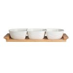 Zdjelice za salatu, umake i grickalice na bazi od bambusa Altom Design porculan, set od 3 zdjelice Set uključuje : 1 x bambusovu dasku / postolje3 x posudu za salatu, umake i grickalice