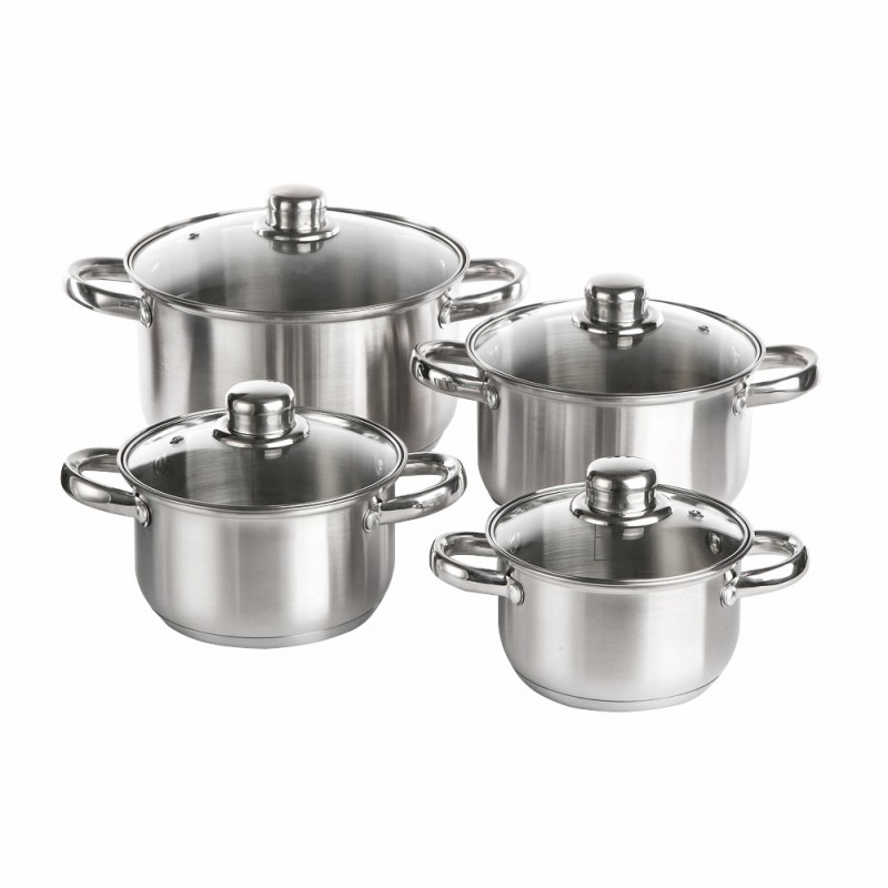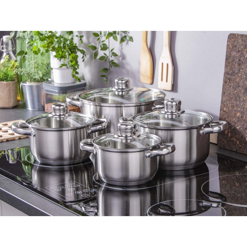 Set posuđa Vito od nehrđajućeg čelika za zdravo i brzo kuhanje Dimenzije seta – set od 4 posude s poklopcima 1 x tava sa poklopcem 14 cm – 1,3 litara, visina 8,5 cm1 x lonac s poklopcem 16 cm – 1,9 litara, visina 9,5 cm1 x lonac s poklopcem 18 cm – 2 , 6 litara, visina 10,5 cm1 x lonac s poklopcem 22 cm – 4,7 litara, visina 12,5 cm Set pouzdanih lonaca vjerojatno je jedan od elemenata koji su najviše povezani s kuhinjom. Izdržljiva, čvrsta, koja će služiti dugi niz godina. Vito posuđe od nehrđajućeg čelika zadovoljava sve ove značajke. Set od četiri nehrđajuće posude s poklopcima odlikuje se zanimljivim dizajnom, a odnosi se na moderne ideje interijera. Nehrđajuće posude s poklopcima Vito karakteriziraju visoka kvaliteta materijala od kojeg su posude stvorene. Funkcionalnost je njihova najvažnija prednost, jer se mogu koristiti na bilo kojoj vrsti štednjaka – također i za indukciju. Prednost lonca je i višeslojno dno,to znači da se lonac brže zagrijava i savršeno akumulira toplinu i raspodjeljuje je, zahvaljujući kojoj se jela brže kuhaju i duže održavaju visoku temperaturu. Nehrđajući lonci su vrlo izdržljivi i otporni na koroziju Debljina stijenke posude iznosi 0,4 mm, zahvaljujući čemu posuđe duže čuva toplinu