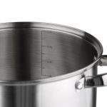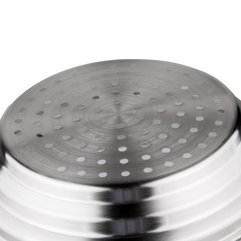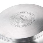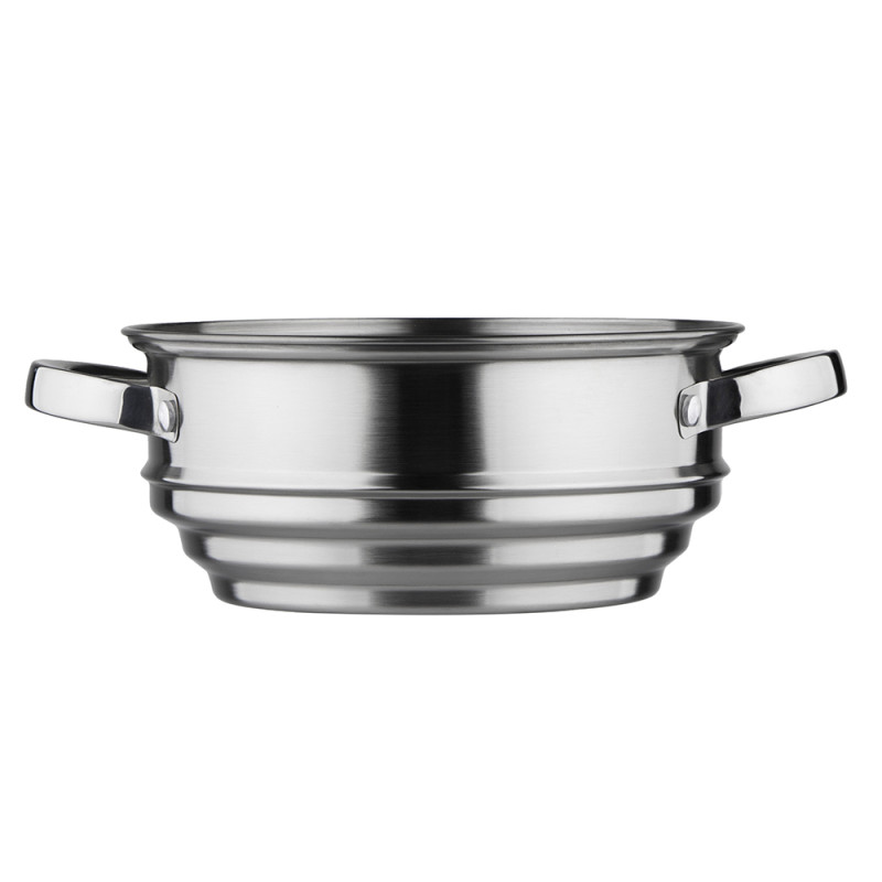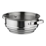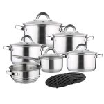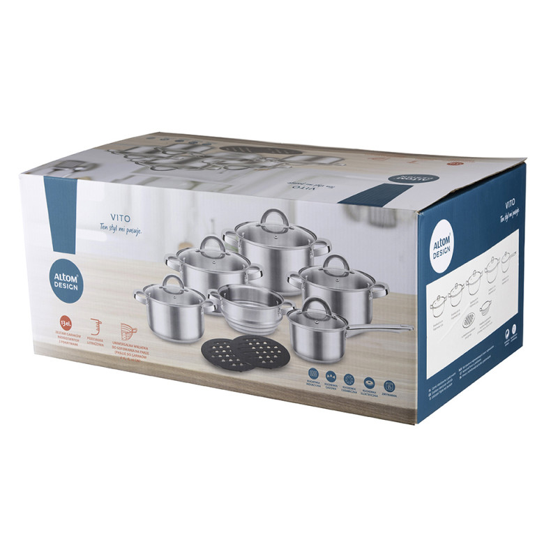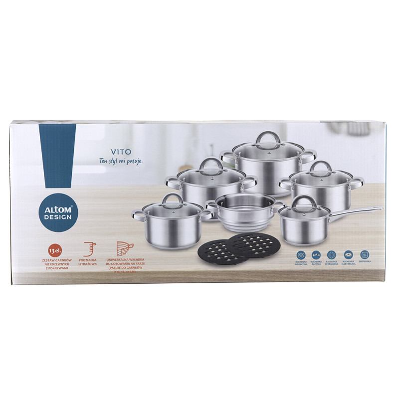 Vito set lonaca od nehrđajućeg čelika kombinira funkcionalnost s dizajnom. Za pripremu ukusnih jela ne trebaju vam vještine kuhara. Samo odaberite prava jela, a priprema ukusnih i punih vitaminskih obroka postat će dječja igra. Vito lonci To je kombinacija kvalitete, funkcionalnosti i stilskog dizajna · Lonci su izrađeni od nehrđajućeg čelika, zahvaljujući kojem ne podliježu izobličenju · Izdržljiv i higijenski nehrđajući čelik osigurava Jednostavno održavanje lonaca čistima · Saten izvana i iznutra – pruža Ekskluzivan izgled tijekom godina · Posebno slojevito Dno vrlo dobro provodi toplinu i omogućuje ravnomjernu raspodjelu po površini, smanjujući rizik od spaljivanja hrane. · Stakleni poklopac opremljen je izlaz za paru, Koji sprječava da hrana proključa · Unutar lonca Praktična matura s Litrageom · Možete ih koristiti na svim izvorima topline, a time i na indukcijskim štednjacima 1 x lonac s poklopcem: promjer – 16 cm, visina – 9,5 cm, kapacitet 1,9 l 1 x lonac s poklopcem: promjer – 18 cm, visina – 10,5 cm, kapacitet 2,6 l 1 x lonac s poklopcem: promjer – 20 cm, visina – 11,5 cm, kapacitet 3,6 l 1 x lonac s poklopcem: promjer – 22 cm, visina – 12,5 cm, kapacitet 4,7 l 1 x lonac s poklopcem: promjer – 14 cm, visina – 8,5 cm, volumen – 1,3 l 1 x univerzalni umetak za paru za posude 16/18/20 cm 2 x postolje za bakelite lonac – promjera 16 cm