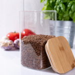Kapacitet proizvoda: 1,15 l Visina: 15,5 cm Širina: 10 cm Čvrsto zatvaranje štiti proizvode od vremenskih utjecaja i gubitka nutritivne vrijednosti. Estetski izgled i visoka kvaliteta su Jamstvo trajnosti Poklopac spremnika izrađen je od plastike koja imitira bambus – ne smije se prati u perilici posuđa