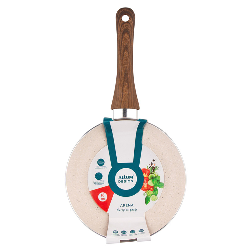 Veličina tave: promjer – 18 cm · prženje u tavi Arena jamči izvrstan okus i miris pripremljenih jela, uz zadržavanje svih nutritivnih vrijednosti · Tava je prekrivena visokokvalitetnim neprijanjajućim premazom s efektom skale koji ima svojstva koja se ne lijepe, sprječavajući lijepljenje · Tava ima debele zidove i dno koji omogućuju bolje nakupljanje i raspodjelu topline, zahvaljujući kojima Jela pripremljena u njemu brže se prže i duže održavaju temperaturu · Prikladan za sve vrste štednjaka, uključujući indukcijske štednjake · Visokokvalitetni neljepljivi premaz čini Održavanje tave čistom vrlo je jednostavno