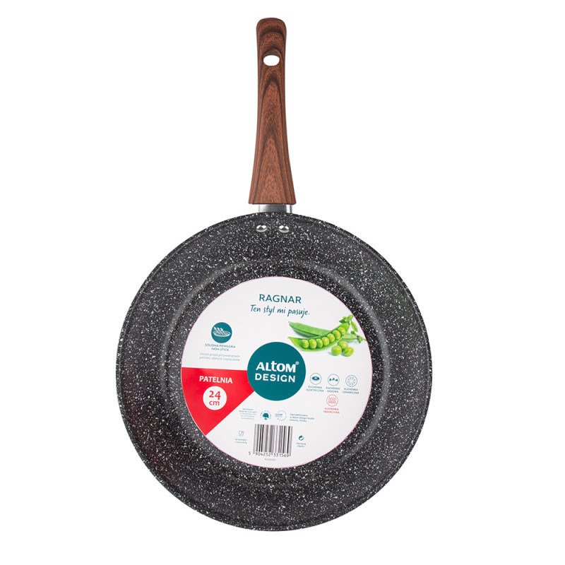 Veličina tave: promjer – 24 cm visina – 4 cm · prženje u tavi Ragnar jamči izvrstan okus i miris pripremljenih jela, uz zadržavanje svih nutritivnih vrijednosti · Tava je prekrivena visokokvalitetnim neprijanjajućim premazom s efektom skale koji ima svojstva koja se ne lijepe, sprječavajući lijepljenje · Tava ima debele zidove i dno koji omogućuju bolje nakupljanje i raspodjelu topline, zahvaljujući kojima Jela pripremljena u njemu brže se prže i duže održavaju temperaturu · Prikladan za sve vrste štednjaka, uključujući indukcijske štednjake · Visokokvalitetni neljepljivi premaz čini Održavanje tave čistom vrlo je jednostavno