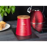 Limenka / posuda za čaj s stožastim bambusovim poklopcem Altom Design crvena, decor TEA Konusne metalne limenke s poklopcima od bambusa praktičan su i dizajnerski način za pohranu kave, čaja, šećera i ostalih sirovina. Dimenzije limenke : promjer poklopca – 10,5 cmpromjer baze – 14 cmvisina – 14,5 cm