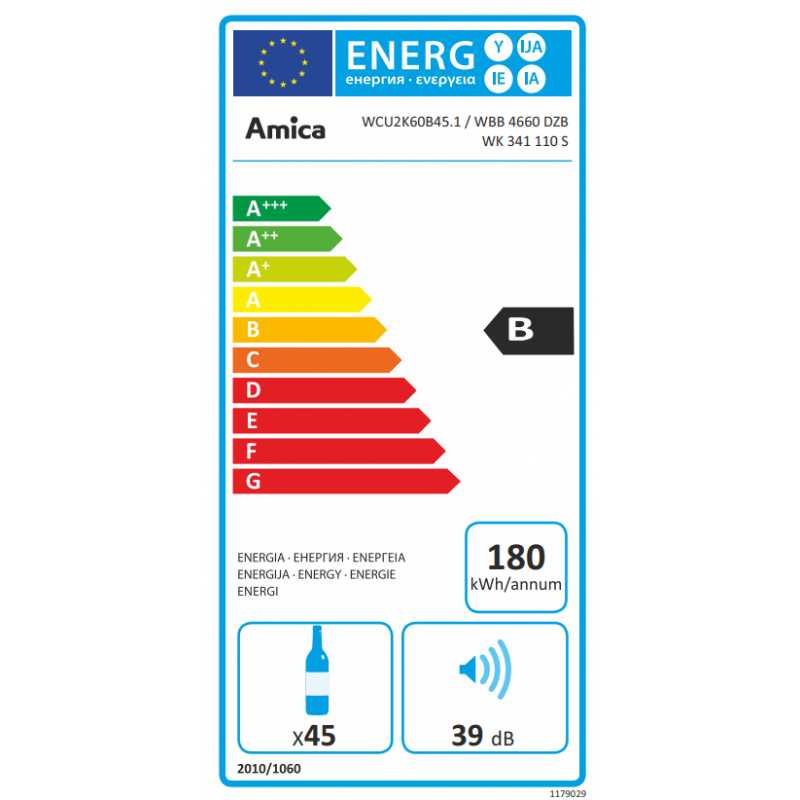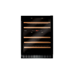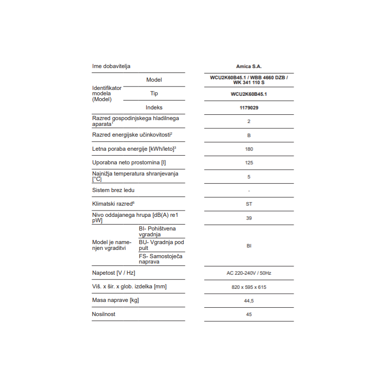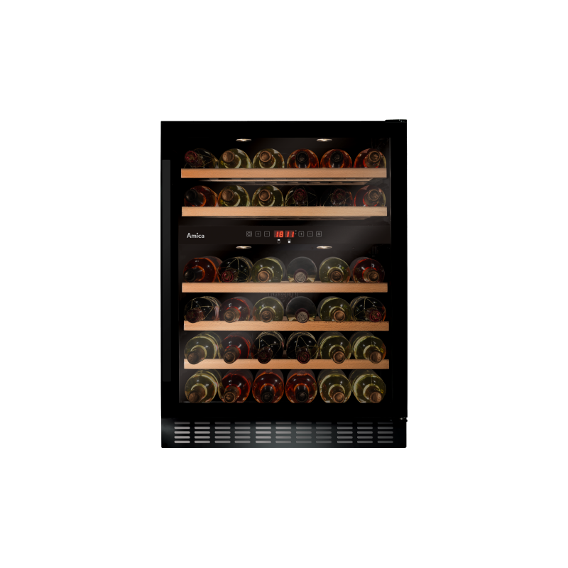Amica ugradbeni / samostojeći vinski hladnjak.. 152 L bruto zapremnina LED rasvjeta alarm za prenisku temperaturu i otvorena vrata 45 boca / 125 litara netto Crna vrata Ugradbeni podpultni Reverzibilna vrata UV filler,LED rasvjeta 2 zone, drvene police Gornja : 5-12 °C, donja 12-20 °C Gornja zona 15 boca, donja zona 30 boca Ener.klasa: B, ST klimatska kl. Potrošnja: 180 kWh/god Dimenzije (cm): 82(v) x 59,5(š) x 60(d) Nivo buke: 39dB