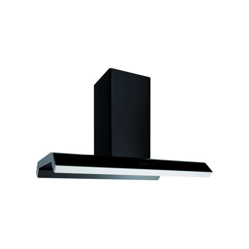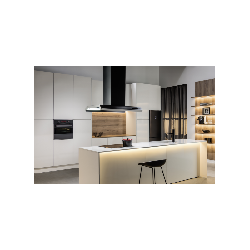 Amica otočna napa 90 cm Sensor Control LED display, automatsko isključivanje, funkcija odgode, broj aluminijskih filtera za masnoću 3, svjetlo: 2x13W, 4 brzine Max snaga izvlačenja: 706m3/h; Glasnoća pri max brzini: 68 db; Dimenzije: 90×55.2-114.2×59.2cm; Boja: crna, staklo