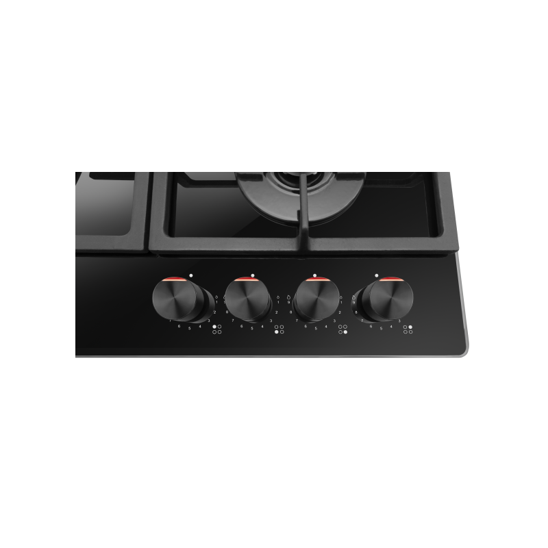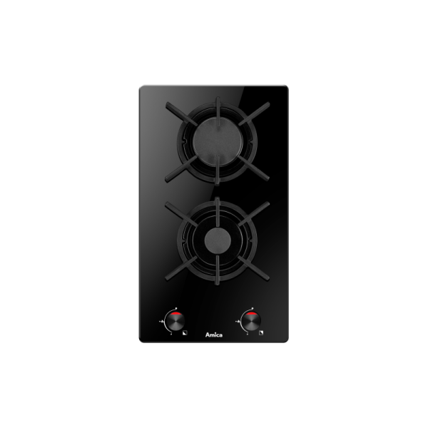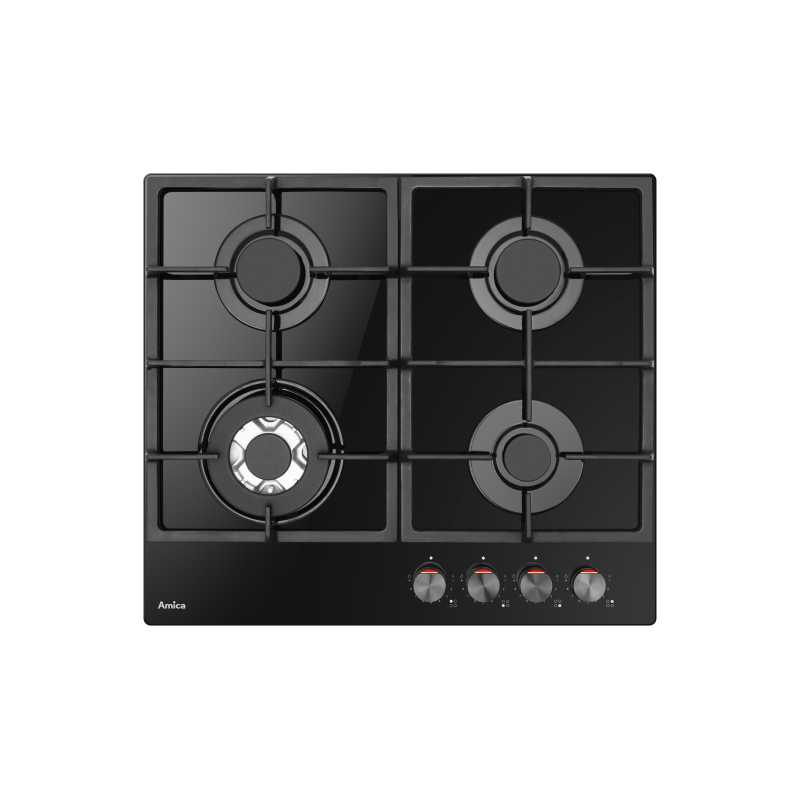 Amica plinska ploča za kuhanje; 4 zone za kuhanje; WOK plamenik, crna, staklokeramika Dodaci: Sigurnosni ventil za plamen; rešetka od lijevanog željeza; električno paljenje; tipke za upravljanje s prednje strane; Ploča: – 5,3 cm Eco pomoćni plamenik (1 kW); – 7,3 cm Eco srednji plamenik (1.8 kW) x 2; – 13,8 cm veliki plamenik (2.8 kW); Dimenzije: 590 x 520 x 50 mm