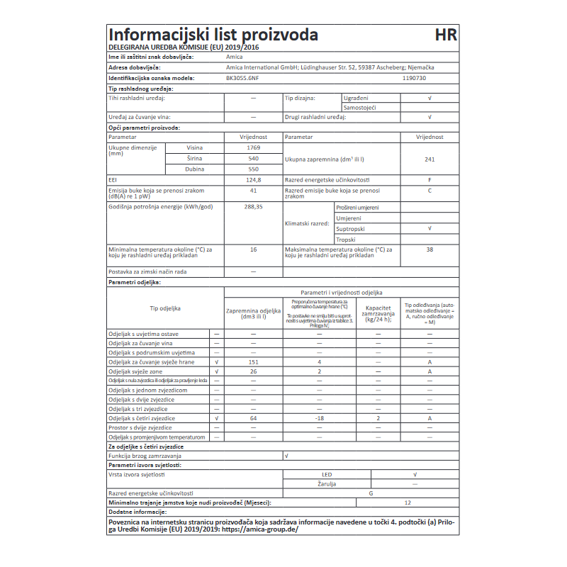 Ugradbeni hladnjak AMICA BK3165.8K, kombinirani, 177 cm, 182/60 l, energetski razred F, bijeliZa vašu udobnostTihi radZvukovi glasnog rada hladnjaka mogu biti neugodni – osobito navečer ili kada je kuhinja spojena s dnevnim boravkom. Ali to nije problem! Hladnjaci Amica s funkcijom Silent Operation dizajnirani su za smanjenje razine buke koju stvaraju mehanički elementi što je više moguće. Ovo rješenje osigurava svakodnevnu udobnost za sve ukućane. Manje decibela, više obiteljskog mira.Univerzalna L/D vrataHladnjak bi se savršeno uklopio u vašu kuhinju, ali vrata se otvaraju u krivom smjeru? Nema problema! U hladnjacima s funkcijom vrata Universal L/R, rupe za montažu su s obje strane – tako da će se vrata otvarati u željenom smjeru! Što ako preuređujete kuhinju ili se selite? Ovo je univerzalno rješenje – u bilo kojem trenutku možete udobno premjestiti vrata na drugu stranu. Vi sastavite, vi odlučujetePolica za boceOtvorite hladnjak… i staklena boca koja se upravo otkotrljala sleti na tlo… Ne ako imate poseban stalak za boce! Uklopljeni oblik police držat će boce na mjestu, a ujedno će vam pomoći da optimalno iskoristite prostor u odjeljku hladnjaka. Polica se može sklopiti i sakriti ili ukloniti ako je trenutno ne koristite. Nema više trpanja boca na silu i živaca svaki put kad otvorite hladnjak!FlexiShelfHladnjak je tako velik, a još uvijek imate problema s ubacivanjem svih proizvoda? Ne s fleksibilnom konfiguracijom FlexiShelfa! Sada, kada vam nešto ne štima, unutrašnjost hladnjaka možete urediti na svoj način – maknite i presložite police kako vam treba i maksimalno iskoristite prostor! Ono što je važno, unatoč čestim promjenama u rasporedu, možete lako održavati hladnjak čistim zahvaljujući posebnom profiliranju reljefa na njegovim stijenkama. Od sada će vam sve odgovarati!DoorShelfTehnički podaciBojaBijelaNeto dubina540 mmširina mreže540 mmNeto težina50 kgVisina mreže1769 mmEnergetski razredfEmisija buke (dB(A) re 1 pW)39 dBEnergetski razredfGodišnja potrošnja energije256,23 kWhKlasa zamrzivača****Klimatska klasaSTPozicija unutarnjeg svjetla – hladnjakplaninaTip unutarnje svjetiljke – hladnjakLEDRashladno sredstvoR600aKapacitet zamrzavanja2,5 kg/24 hUkupni kapacitet242Kapacitet zamrzivača60 litaraKapacitet hladnjaka182 litreVrijeme skladištenja u slučaju nestanka struje20 satiFrekvencija50 Hz