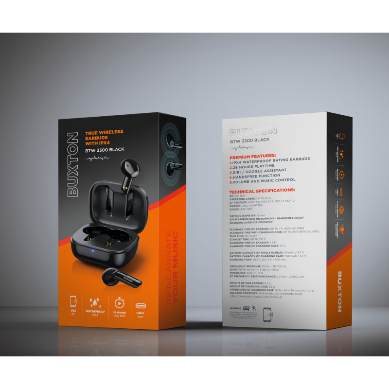 BTW 3300 – TWS slušalice s IPX4Dajte bubnjićima dobru dozu glazbene radosti. Slušalice BTW 3300 osiguravaju kvalitetno uživanje u svakom trenutku, bez obzira želite li se prepustiti trenutku blagostanja ili se aktivno baviti sportom. Oni će biti izvrstan partner čak i ako više volite duge pozive s prijateljima ili obitelji, bez brige o dugotrajnoj vezi, jer će standardni Bluetooth biti dovoljan.Dugo trajanje baterije kao bonusIzdržljivost je danas jedna od najvažnijih značajki slušalica, tako da ćete u tom pogledu sigurno biti zadovoljni. BTW 3300 uključuje kućište za punjenje koje može napuniti slušalice za 1,5 sata, pružajući ukupno do 26 sati igranja. Ako napustite kutiju, imate 7 sati neprekidne zabave bez potrebe za punjenjem.Partner napravljen za zabavuBTW 3300 izgrađen je za zabavu u bilo kojoj mjeri, s jednostavnim dizajnom koji mu daje pravi pogon. Ako tražite vodootpornog pratioca koji vas može pratiti, vjerojatno ćete biti na pravom mjestu. Brzo i jednostavno postavljanje omogućuje kontrola dodira s mogućnošću uključivanja Google asistenta /SIRI-ja.Premium značajke: IPX4 vodootporne slušalice 26 sati reprodukcijeSIRI / Google Assistant Hands-freefunkcija Glasnoća i kontrola glazbe Tehničke specifikacije:SIRI / Google AssistantInteligentna kontrola dodira (reprodukcija glazbe, odgovaranje na pozive, kontrola glasnoće i pomoćnik)Vodootporne slušalice u IPX4Bluetooth certifikatu: V5.1 BLEBT raspon veza: 10 mBT profili: A2DP 1.3, AVRCP 1.6, HFP 1.7, HSP 1.2 Raspon frekvencijskog odziva Bluetooth frekvencije: 2.4 GHz – 2.4835 GHzČipset: Jieli AD6973D4Kodek: AAC, SBCPromjer : 13 mmSvaka slušalica jedan mikrofon – handsfree spremanIndikator punjenja slušalicaVrijeme po punjenju: do 7 h (80% volumena) Ukupno vrijeme reprodukcije: do 26 h (80% volumena)Vrijeme razgovora: do 8 h Vrijeme čekanja: do 210 h Vrijeme punjenja slušalica: 1,5 h Vrijeme punjenja kućišta: 1,5 hKapacitet baterije za pojedinačne slušalice: 45 mAh / 3,7 V Kapacitet baterije kućišta za punjenje: 350 mAh / 3,7 VPriključak za punjenje: USB-C (DC 5 V / 300 mA) Frekvencijski odziv: 20 Hz – 20.000 Hz Osjetljivost: 92 dB +/- 3 dB (pri 1 kHz) Impedancija: 32 Ω +/- 15%Težina jedne slušalice: 3,7 g Težina kućišta za punjenje: 29 gDimenzije kućišta za punjenje: 53,8 x 44 x 30 mm (W / H / D)