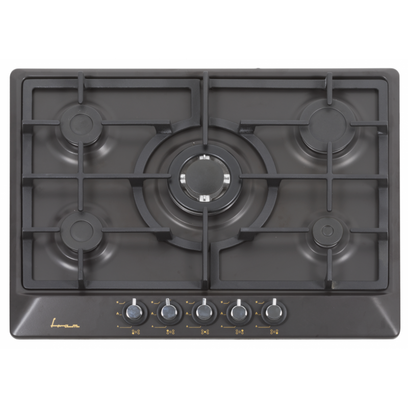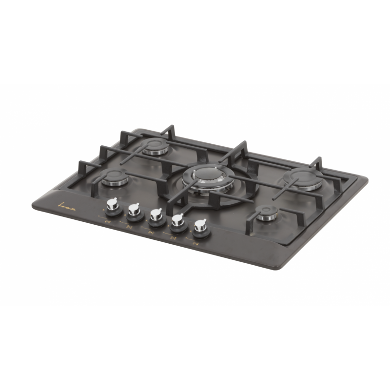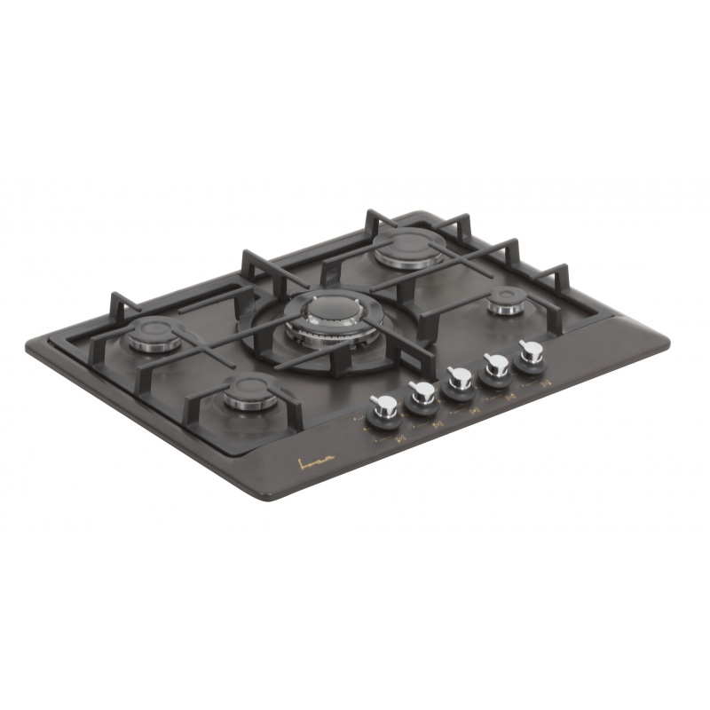 5 plinskih plamenika Wok plamenik Prednja kontrola Integrirano električno paljenje Sustav sigurnosti plina Roštilj od lijevanog željeza Uključene mlaznice LPG-a Dimenzije : 69×52 cm Boja: Crna