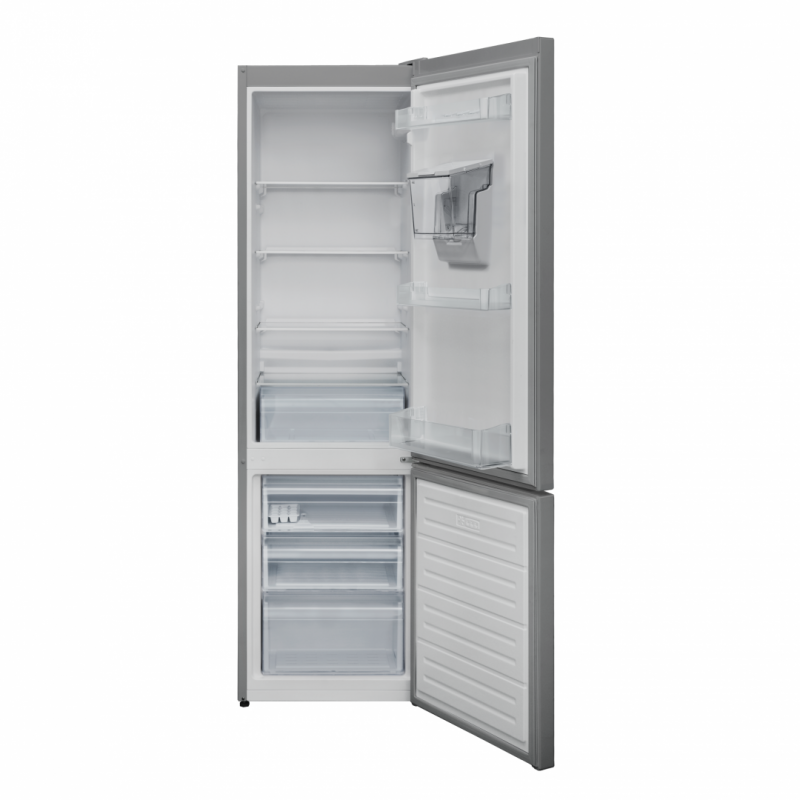 Heinner HC-V286SWDF + kombinirani hladnjak, Energetski razred: F, Manje mraznog sustava hlađenja, Dozator vode, Ukupni kapacitet: 288L, Kapacitet hladnjaka: 204L, Kapacitet zamrzivača: 84L, Mehanička kontrola s podesivim termostatom, LED svjetlo, funkcija “Super zamrzavanje”, 3 staklene police hladnjaka, Odjeljak za voće i povrće, 3 ladice za zamrzavanje, Reverzibilna vrata, Držač jaja, Ladica za kocke leda, Kapacitet smrzavanja: 3,9 kg / 24h, Dimenzije (ŠxDxV): 54 x 59,5 x 180 cm, Boja: Srebro s kromiranim ukrasom na ručki