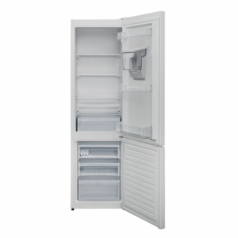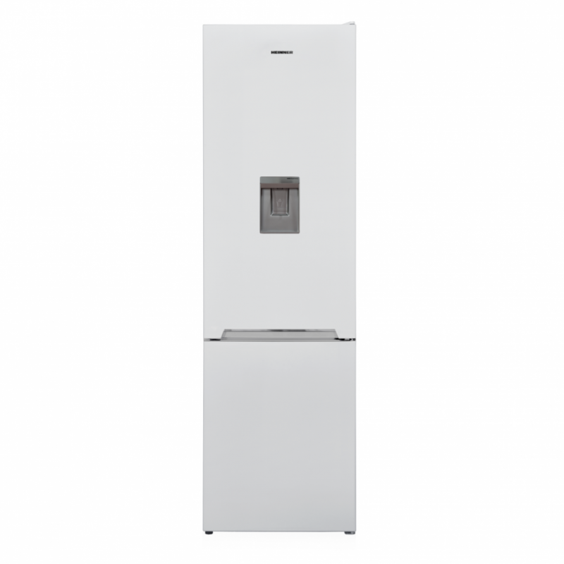 Heinner HC-V286WDF+ kombinirani hladnjak, Energetski razred: F, Sustav hlađenja manje mraza, Dozator vode, Ukupni kapacitet: 288L, Kapacitet hladnjaka: 204L, Kapacitet zamrzivača: 84L, Mehanička kontrola s podesivim termostatom, LED svjetlo, funkcija “Super zamrzavanje”, 3 police hladnjak stakla, odjeljak za voće i povrće, 3 ladice za zamrzavanje, Reverzibilna vrata, Držač jaja, Pladanj za kocku leda, Kapacitet smrzavanja: 3,9 kg / 24h, Dimenzije (ŠxDxV): 54 x 59,5 x 180 cm, bijela s kromiranim ukrasom na ručki