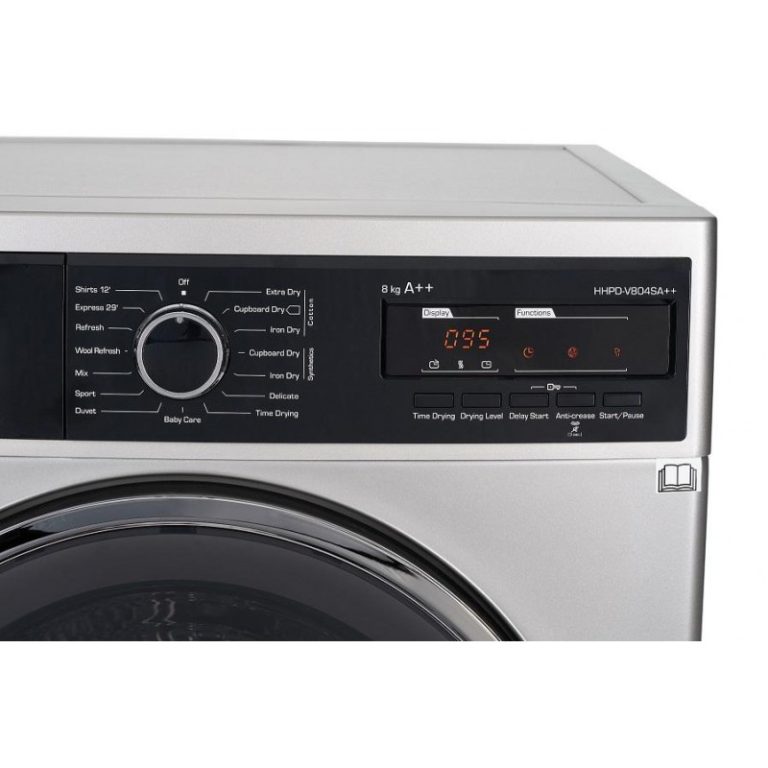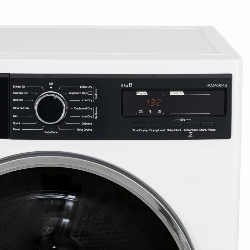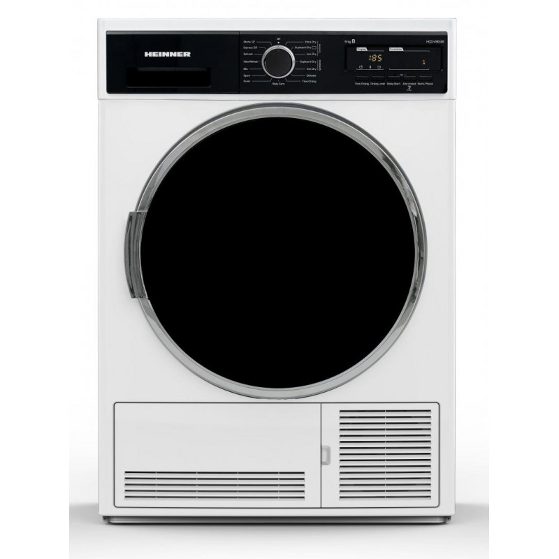 Sušilica kondenzacijska Heinner HCD-V904B, Kapacitet 9 kg, Klasa energetske učinkovitosti B, 15 programa sušenja, Elegantan dizajn s crnom pločom i kromiranim vratima, LED zaslon, Košulje 12 min, Expres 29 min, Program za njegu beba, Odgoda, Funkcija anti-nabora, Bubanj svjetlo, Odabir razine sušenja, Lint filter indikator, Puni indikator spremnika za vodu, Dječja brava, Dimenzije (ŠxDxH): 59,6×60,9×84,5 cm, Boja: Bijeli Neto dimenzije Težina 38,50 kg Visina 84,50 cm Širina 59,60 cm Dubina 60,90 cm