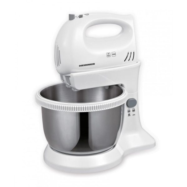 Heinner HMB-350UV mikser sa posudom, snaga: 300W, 5 brzina + turbo, rotirajuća posuda: 2,5 l, pribor od nehrđajućeg čelika: 2 pjenjače + 2 kuke za gnječenje, gumb za izbacivanje sa sigurnosnim uređajem, gumb za otpuštanje miješalice za ruke Specifikacije proizvoda Neto dimenzije Visina 34,1 cm Širina 21,3 cm Dubina 30,2 cm Težina 2,13 kg