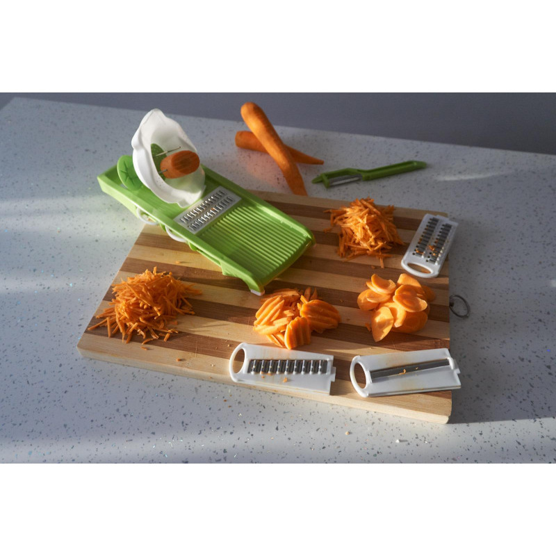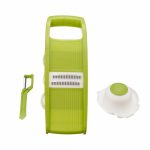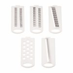 VIŠENAMJENSKE REŠETKE 7 KOMADA 5 x različitih oblika za rezanje i ribanje 11×4,5 cm 1 x sigurnosna ručka 12×5,5 cm 1 x vertikalno sredstvo za čišćenje voća i povrća 17×3 cm VeličinaL 32×12 cm Materijal: plastika + nehrđajući čelik