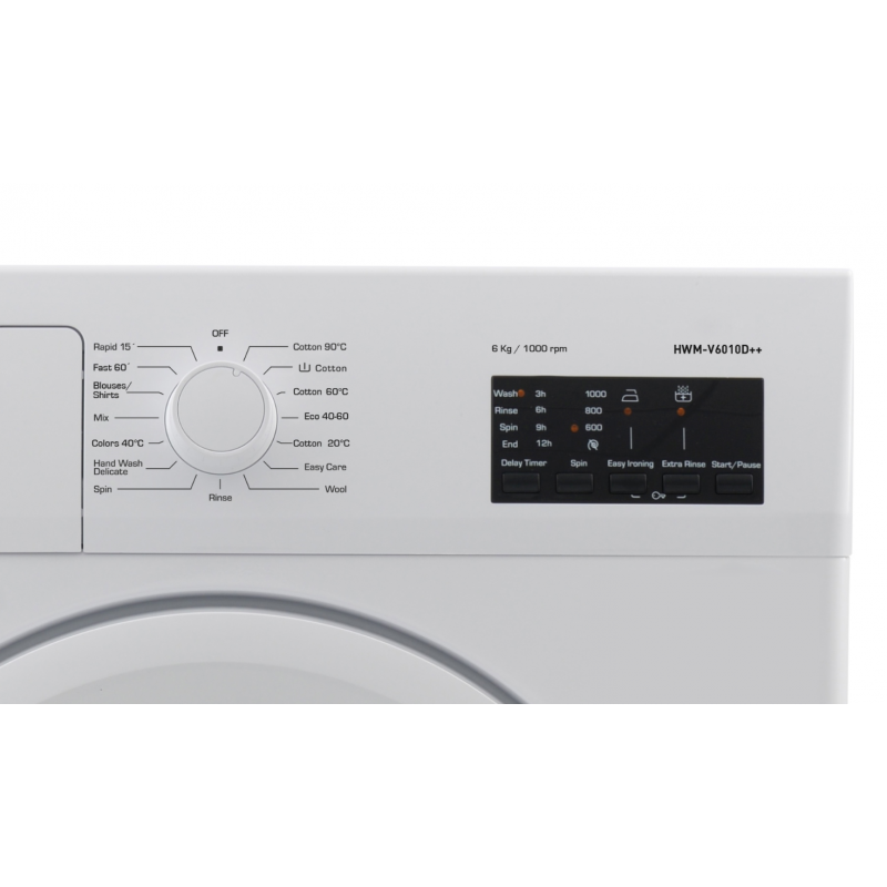 Heinner perilica rublja HWM-V6010D++, 6KG, 1000 O / MIN, ENERGETSKI RAZRED D, LED ZASLON, 15 PROGRAMA, ODGOĐENI START, ECO LOGIC SUSTAV, BRZI PROGRAM 15 MIN Funkcije Kasni početak Dodatno ispiranje Anti-sifoniranje Blokiraj podređeni pristup Brzi program 15 min Centrifugalna brzina 1000 okretaja u minuti Broj programa: 15 Energetski razred D Kapacitet 6 kg
