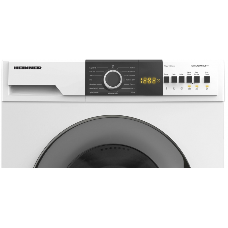 HEINNER PERILICA RUBLJA HWM-VT2714INVB+++, KAPACITET 7 KG, BRZINA CENTRIFUGE 1400 O / MIN, ENERGETSKI RAZRED B, INVERTERSKI MOTOR, 15 PROGRAMA, LED ZASLON, BRZI PROGRAM 15 MIN, KRATKI PROGRAM 60 MIN, PROGRAM SIGURAN ZA ALERGIJE, FUNKCIJA ODGOĐENOG POKRETANJA, DODATNO ISPIRANJE, FUNKCIJA PROTIV NABORA, EKO LOGIČKI SUSTAV, SUSTAV DETEKCIJE PJENE, ELEKTRONIČKI SUSTAV KONTROLE RAVNOTEŽE, DJEČJA PRISTUPNA BRAVA, DIMENZIJE (LXAXI): 59.7×49.7×84.5 CM, BOJA: BIJELA