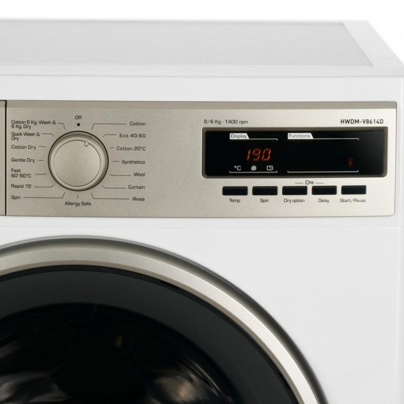 Heinner perilica rublja sa sušilicom HWDM-V8614D, kapacitet pranja 8 kg, kapacitet sušenja 6 kg, brzinom centrifuge 1400 o / min, energetskim razredom D, 15 programa, LED zaslonom, Brzim programom 15 min, Program pranja i brzog sušenja 1H, 3 mogućnosti sušenja, Funkcija odgođenog pokretanja, Sustav detekcije pola opterećenja, Selektor temperature pranja, Birač brzine centrifuge, Dječja pristupna brava, Dimenzije: 59,7×58,2×84,5 cm, Boja: Bijela