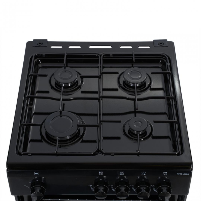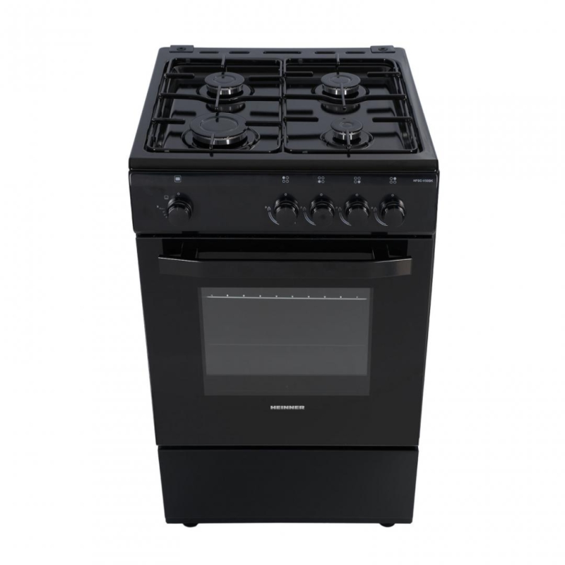 Plinski štednjak Heinner HFSC-V50BK, 50x50cm, 4 plinska plamenika, držač cakline, metalni poklopac, ploča za kuhanje i pećnica sigurnosnog uređaja, vrata pećnice s dvostrukim staklom, uključene mlaznice UNP-a, kromirana ladica i roštilj, dimenzije ( ŠxVxDxV): 50×49,5×85 cm, Boja: Crna