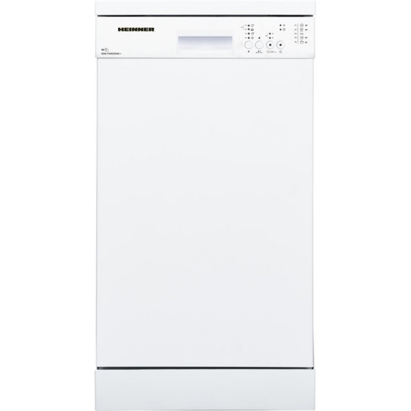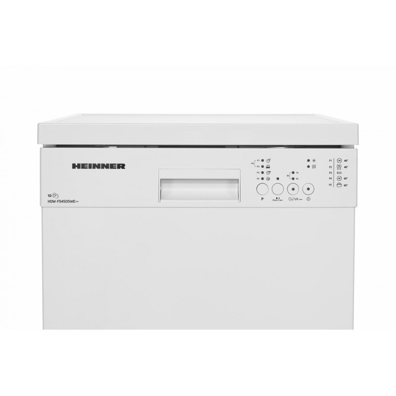 Heinner samostojeća perilica posuđa HDW-FS4505WE++, 10 setova, energetski razred E, elektroničko upravljanje, 5 programa pranja, 30′ brzi program, Kup/ Delikatni program, intenzivan program, ECO program, opcija polupunog opterećenja, programabilni start (3-6-9H), gornja košara podesiva po visini (prazna), zaštita od poplava – Aquastop, potrošnja vode: 11L / ciklus pranja, dimenzije : 85 x 44,8 x 59,8 cm Dimenzije Širina 45 cm, Neto dimenzije Visina 85,00 cm, Dubina 59,80 cm, Težina 35,80 kg, Širina 44,80 cm, Pola opterećenja Da Broj košara 2 Kapacitet 10 setova Broj programa 5 Energetski razred E Boja Bijela Odgođeni početak Da Vrsta prikaza Ne Funkcije proizvoda Aquastop Programi Brzih 30′, nježnih 40°C, eko, super 50′, intenzivno 65°C