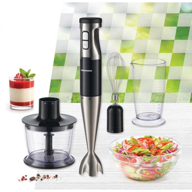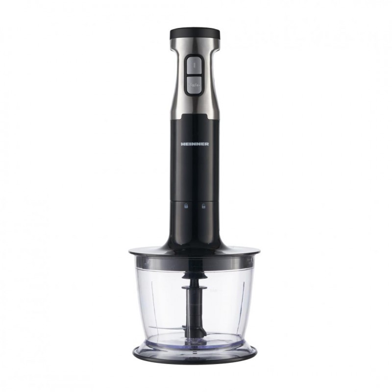 Heinner HB-1000XBK štapni mikser set, snaga: 1000W, promjenjiva brzina + Turbo funkcija, komplet dodataka: sjeckalica, pjenjača i posuda za miješanje, kapacitet posude: 700ml, kapacitet sjeckalice: 500ml, blender od nehrđajućeg čelika, noževi od nehrđajućeg čelika