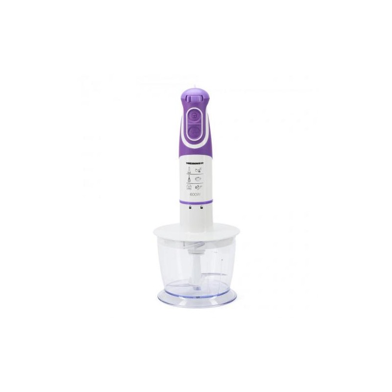 Set sadrži: sjeckalica, pjenjača i šalica za miješanje   Lopatice od nehrđajućeg čelika   5 brzina + Turbo   Karakteristike Kapacitet šalice: 700ml   Kapacitet sjeckalice: 500ml   Odvojiva osovina za miješanje čelika   Snaga od 600W   Tehnički podaci Razina buke: <85dB   Napon: 220-240V ~ 50Hz