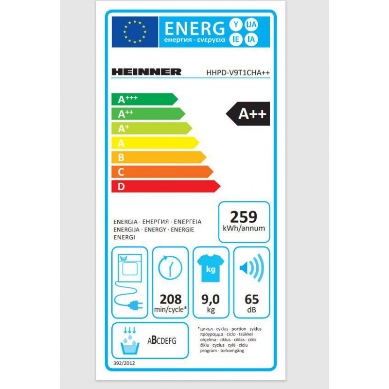 Sušilica rublja s toplinskom pumpom Heinner HHPD-V9T1CHA++ kapacitet 9 kg, Energetski razred A++, 15 programa sušenja, LED zaslon, Brzi raspored košulja 20 min, Brzi raspored košulja 34 min, Ekspresni program 59 min, Program za njegu osjetljive tkanine, Funkcija odgođenog starta, Funkcija protiv bora, VAT svjetlo, Selektor razine sušenja, Lint indikator čišćenja filtera, Indikator spremnika za prikupljanje pune vode, Dječja pristupna brava, Dimenzije (LxAxI): 6,56×3,84×5,<> cm, Boja: Bijela Opće specifikacije Energetski razred A++ Broj programa 15 Kapacitet sušilice 9 kg Boja Bijeli Funkcije Odgođeni početak, njega osjetljive tkanine, svjetlo za PDV, brava za pristup djeci, protiv gužvanja,razine sušenja Upravljačka ploča VODIO Brzo trajanje programa 20 min Motor Standard