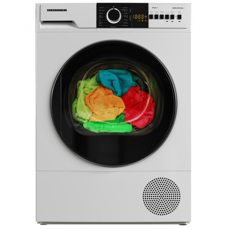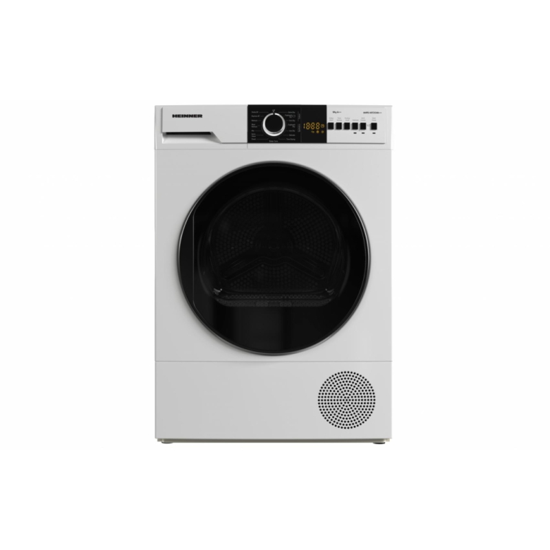 Sušilica rublja s toplinskom pumpom Heinner HHPD-V9T2CHA+++, Kapacitet 9kg, Energetski razred A+++, Inverterski motor, 15 programa sušenja, LED zaslon, Brze programske košulje 20 min, Ekspresni program 34 min, Program njege osjetljivog rublja, Funkcija odgođenog pokretanja, Funkcija protiv bora, Svjetlo u bubnju, Birač razine sušenja, indikator čišćenja filtra za dlačice, Indikator za prikupljanje pune vode, Zaključavanje pristupa djeci, Dimenzije ( ŠxDxV): 59,6×60,9×84,5 cm, Boja: Bijela